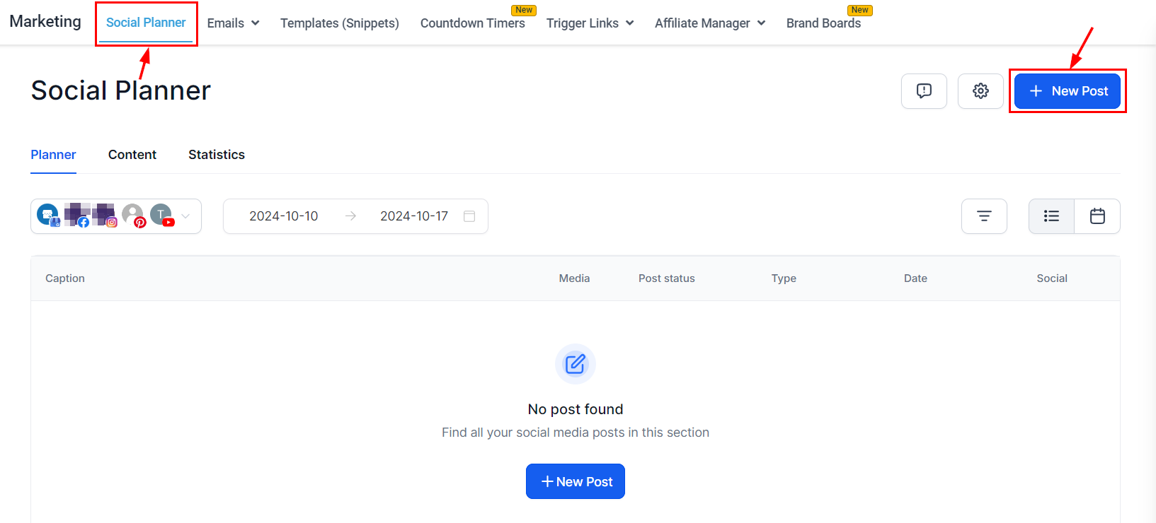 Start by going to the โMarketingโ tab in the left sidebar then to the Social Planner. Here, create a new post from scratch, the template library, or upload from a CSV.