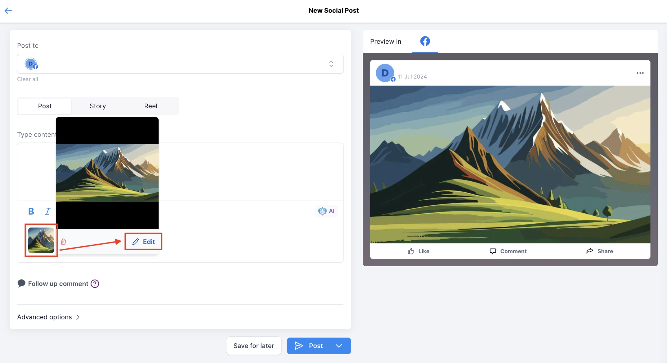 Once you have selected your new post and the content for that post, click the mini image in the bottom left. After you click the image, you will see the option to edit appear.