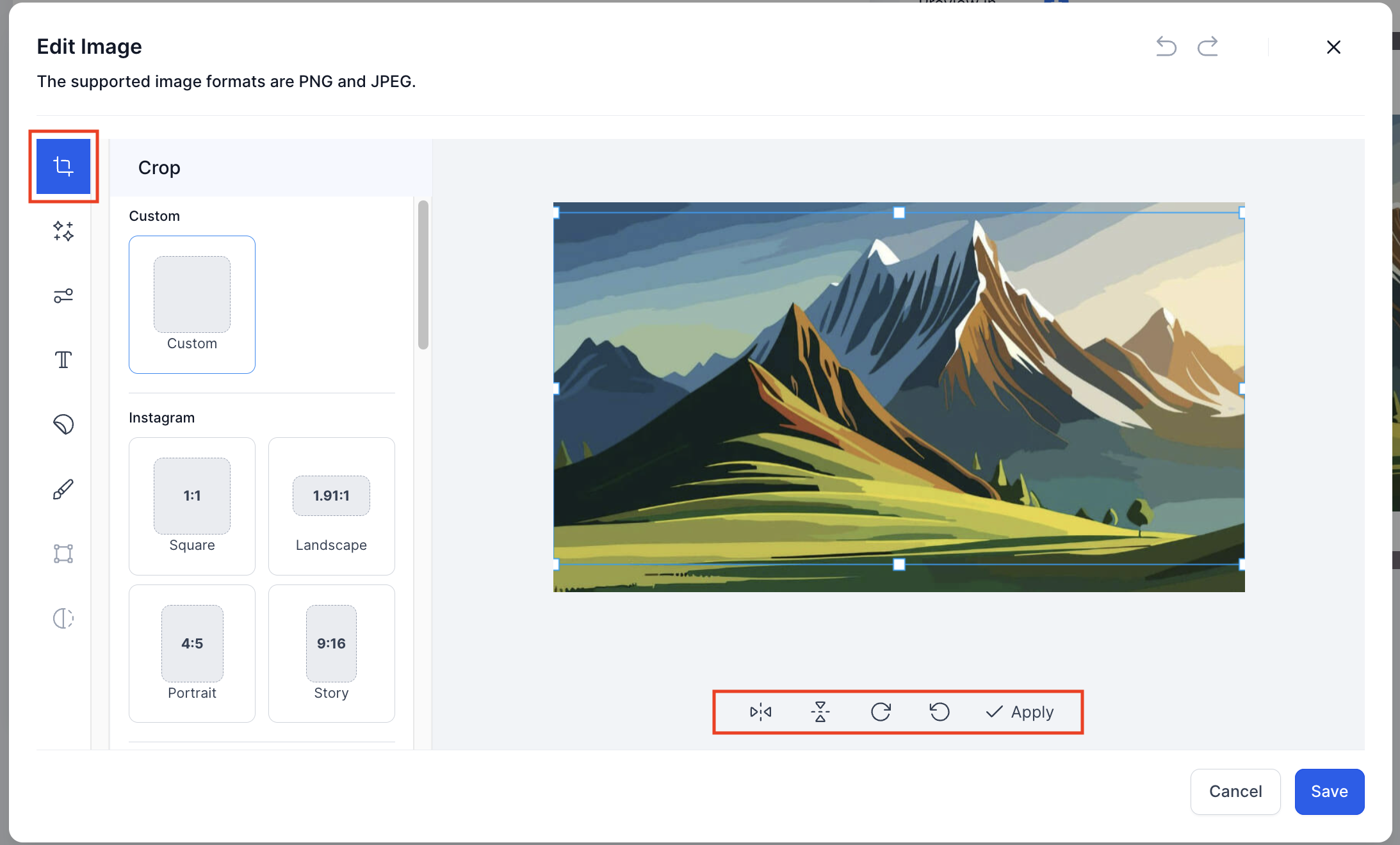 The first option you'll have for editing your image is to crop it. You have the option to custom crop, crop for Instagram, Facebook, Twitter (X), LinkedIn, and a variety of common ratios to choose from.