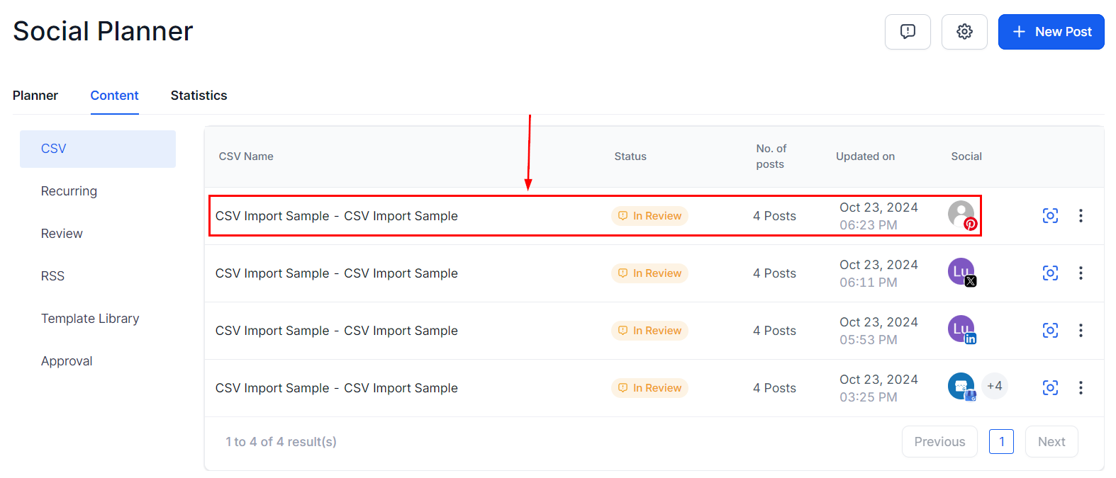 After the posts are imported by clicking on Process CSV, they need to be reviewed by the chosen approver. Once approved, they are scheduled on the social calendar. If no approver is selected they will be scheduled directly.