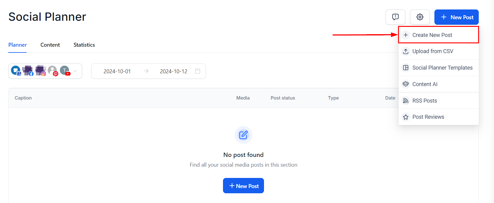 You will then be presented with multiple posting options such as using Social Planner Templates, or Content AI. This guide will walk you through creating a new post and uploading a CSV file to publish a Facebook post.