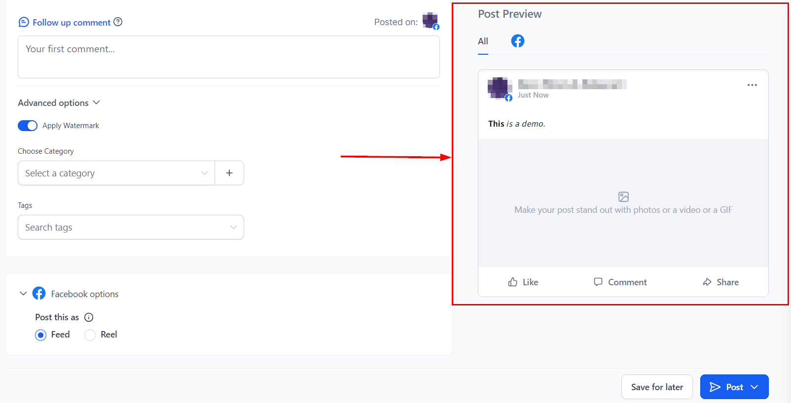 Under Advanced Options, you can apply your watermark to images, choose categories for better organization, and add tags to enhance searchability and categorization of posts. Furthermore, you can choose whether your post should be published on your feed or as a reel.