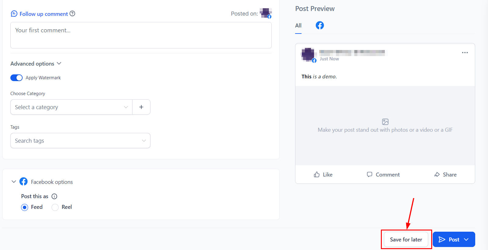 Alternatively, utilize the save for later feature to save your post as a draft for further editing.