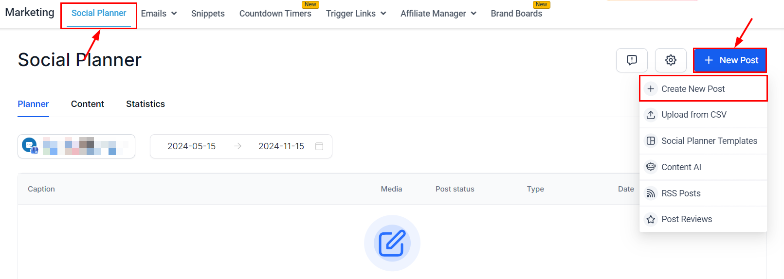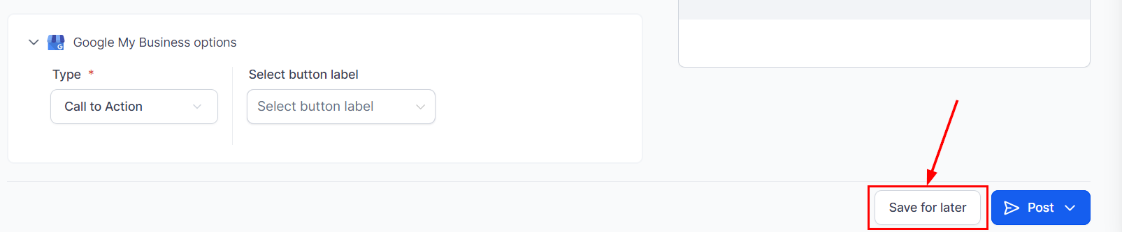 To begin posting on GMB, start by selecting the blue "New Post" button located at the top right corner of the Social Planner, then choose the option to create a new post.