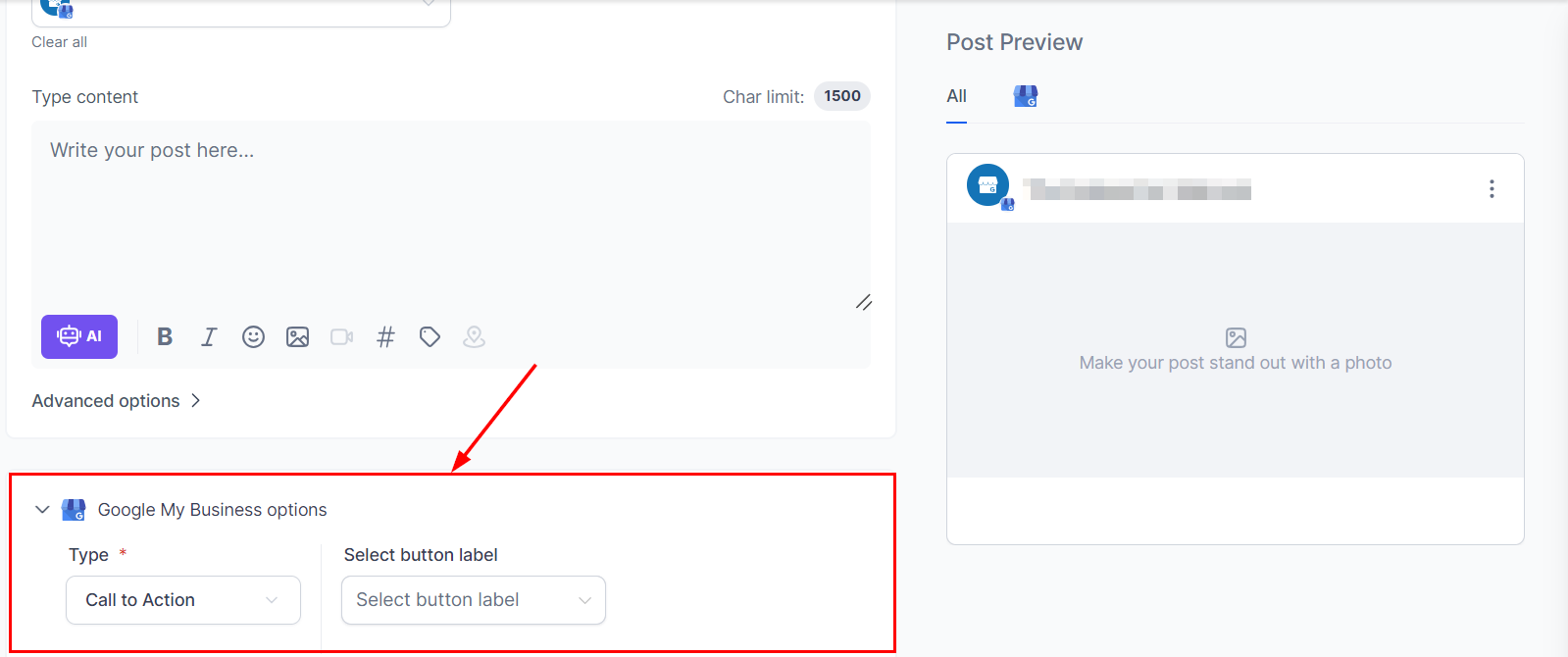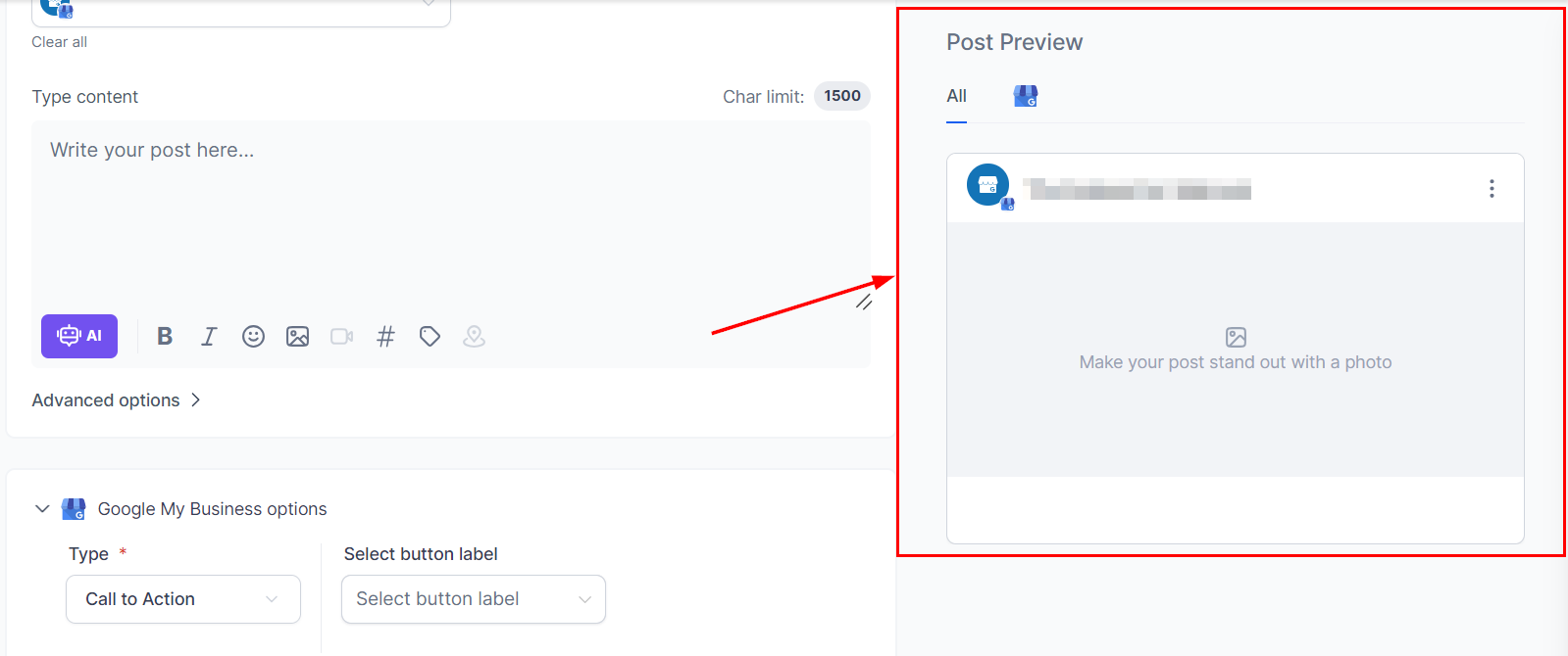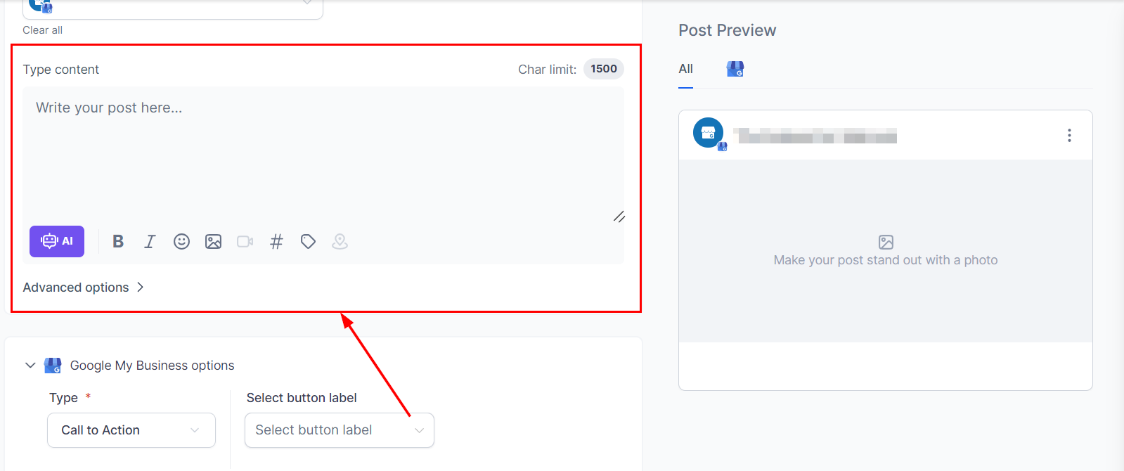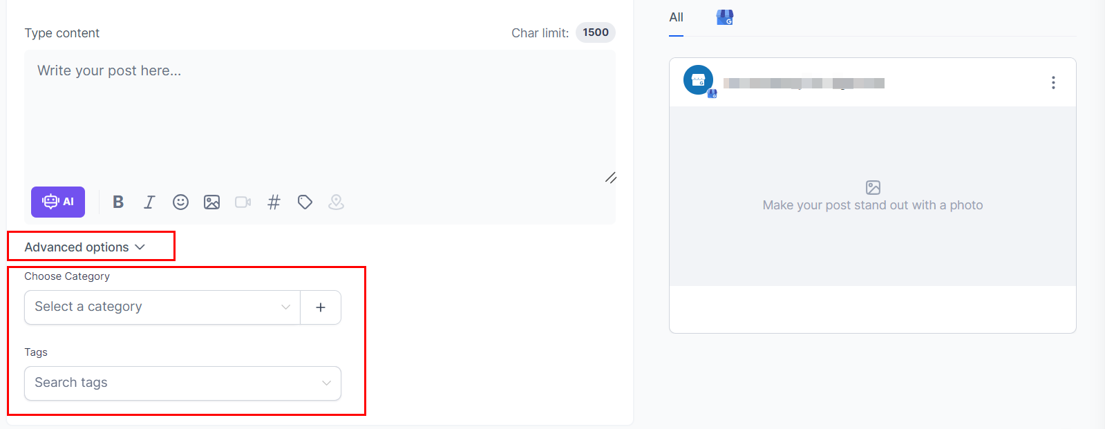 In the content field, type your message, include rich media, and add relevant hashtags. Enhance your post by utilizing formatting options such as bold and italic text, and integrating images. Additionally, consider employing custom values or Content AI to refine your post. Ensure that you do not exceed the 1500-character limit!
