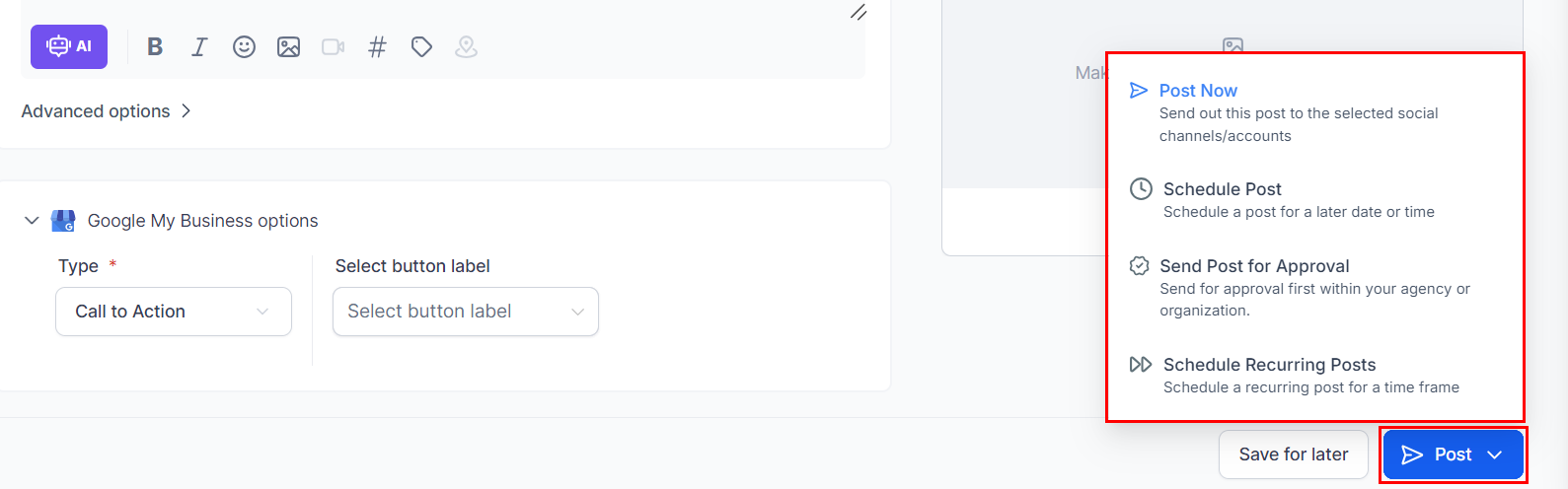 Post Now: Send your post to the selected GMB listings immediately.