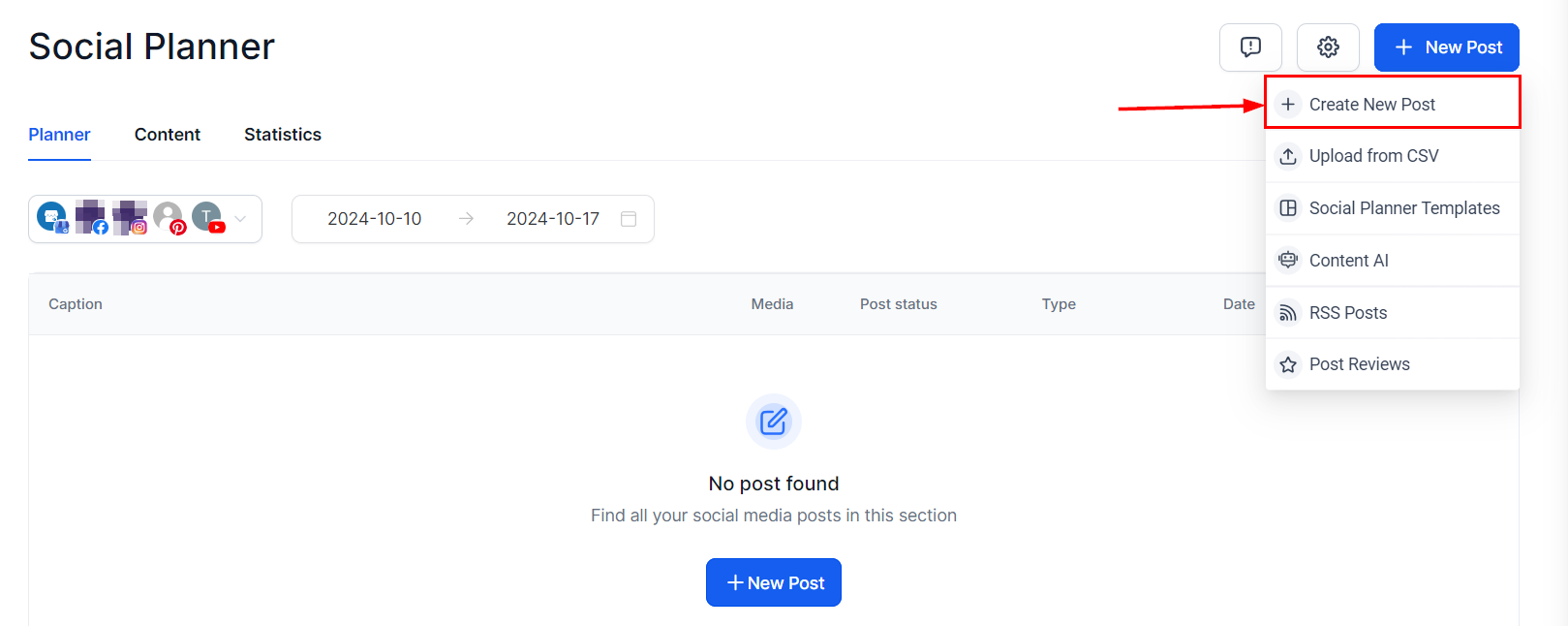 To begin, simply click the blue "New Post" button located in the top-right corner of the Marketing > Social Planner section.
