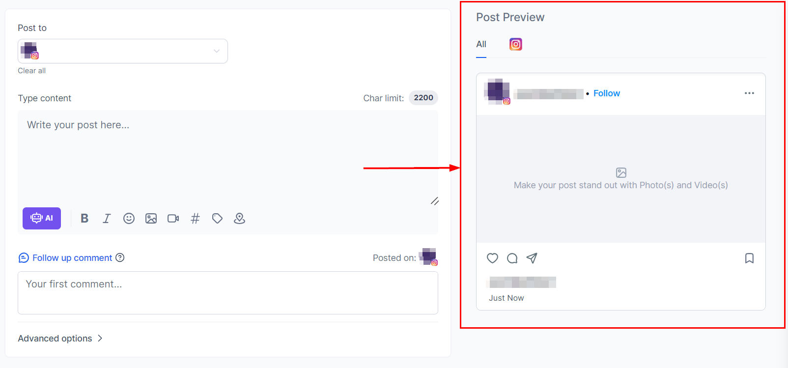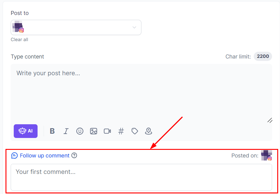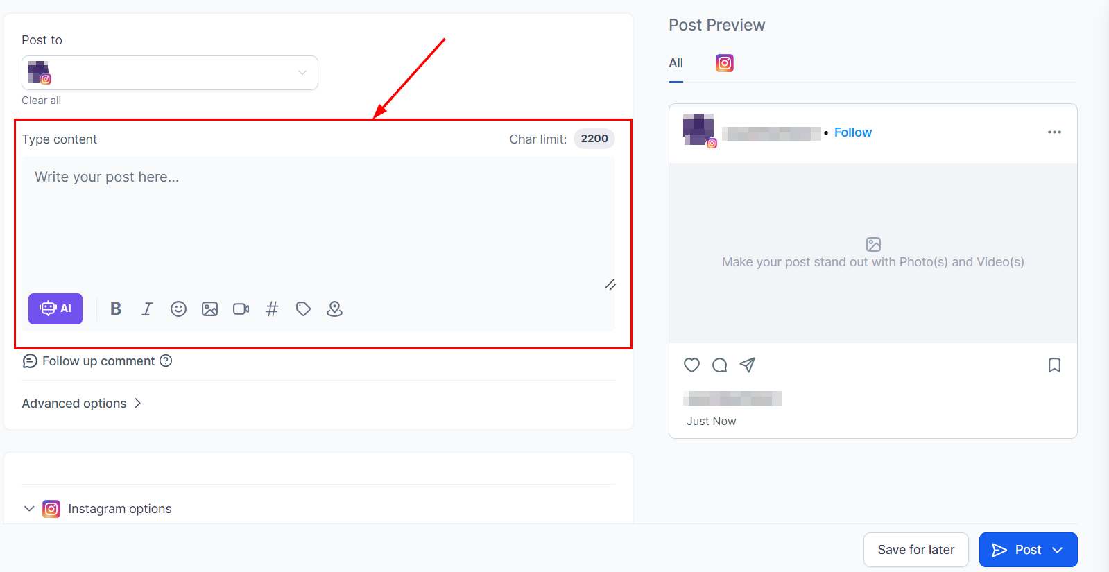 From the "Post To" dropdown menu, select the Instagram account(s) you would like to publish the post. This dropdown will display all the accounts integrated with the platform, allowing you to choose the correct one for your intended audience.