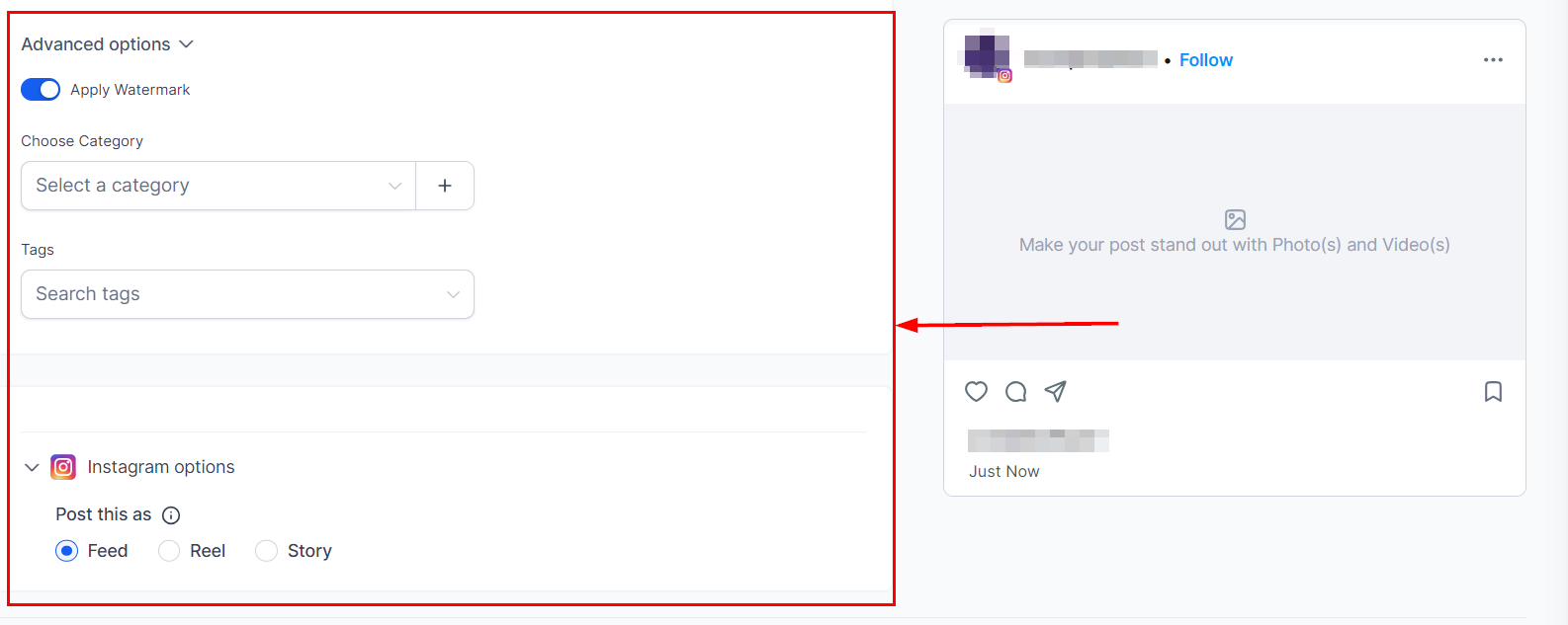 Under Advanced Options, you can apply your watermark to images, choose categories for better organization, and add tags to enhance searchability and categorization of posts. Furthermore, you can choose whether your post should be published on your feed or story, or as a reel.