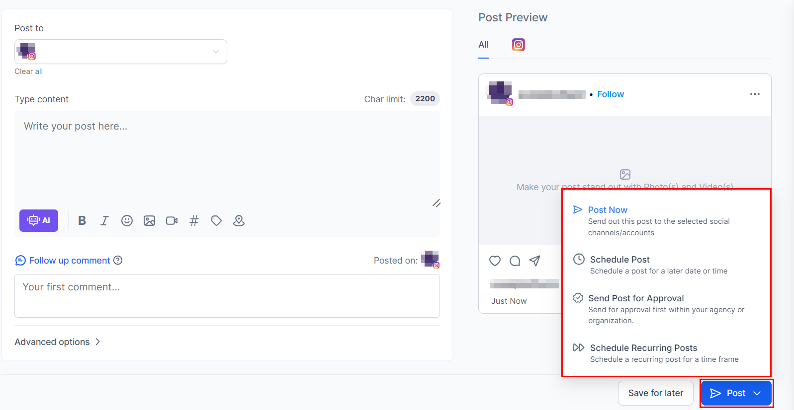 Post Now: This will allow you to send this post to the selected account(s) immediately.
