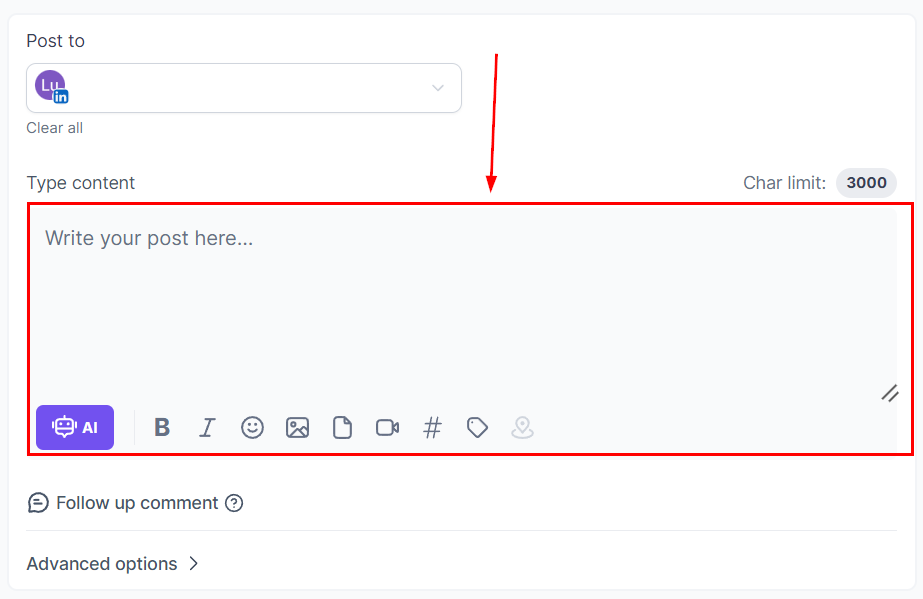 Add your caption and hashtags, or click the AI tool icon for assistance. Enhance your post with bold or italic text, images, videos, or carousel content.
