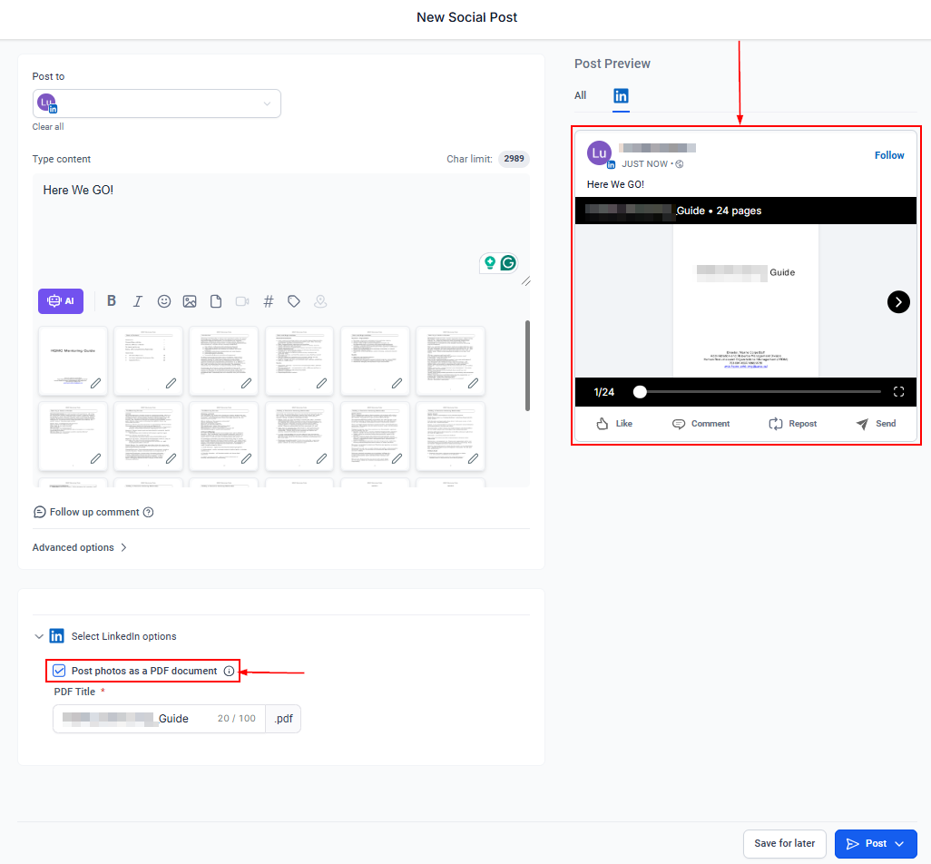 By default, “Post photos as a PDF document” is enabled when you upload a PDF. If you disable this option, the images within the PDF will upload as single photos instead.