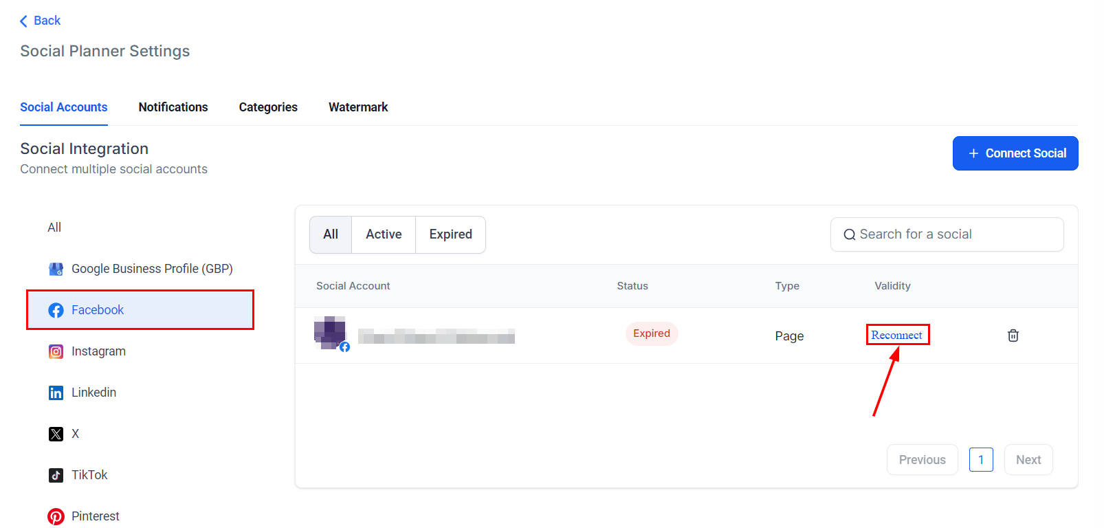 To reconnect a page or group within the Social Planner tab, go to the Social Planner settings and navigate to the Facebook section. Here, you will see a list of all connected Facebook accounts. Simply click the βReconnectβ button next to the relevant account to restore the connection. Alternatively, you can delete the connection to the Facebook Page/Group by clicking the trash icon before attempting to reconnect.