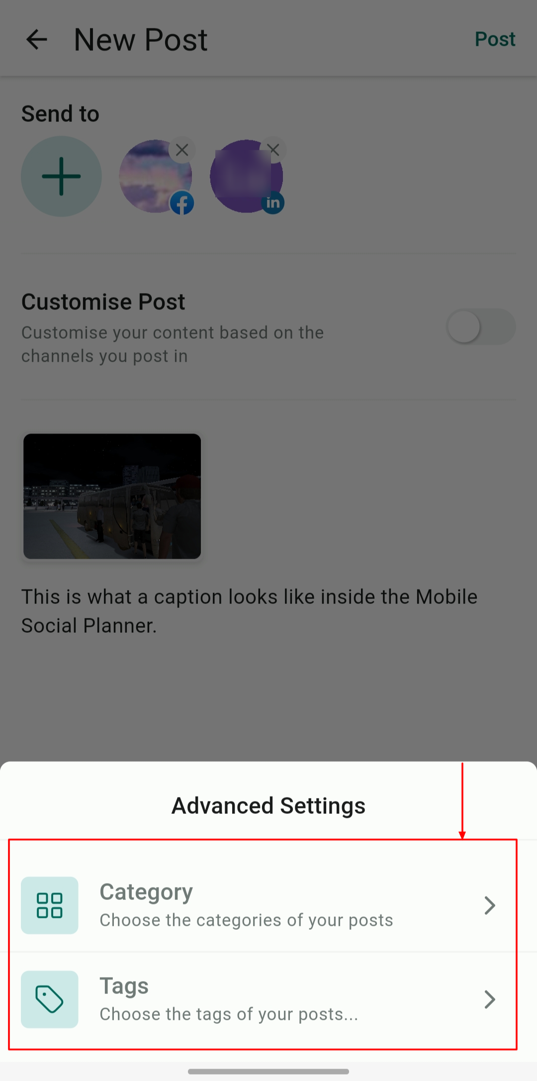 Click on Advanced Settings to Assign Categories for proper organization and Tags to posts.