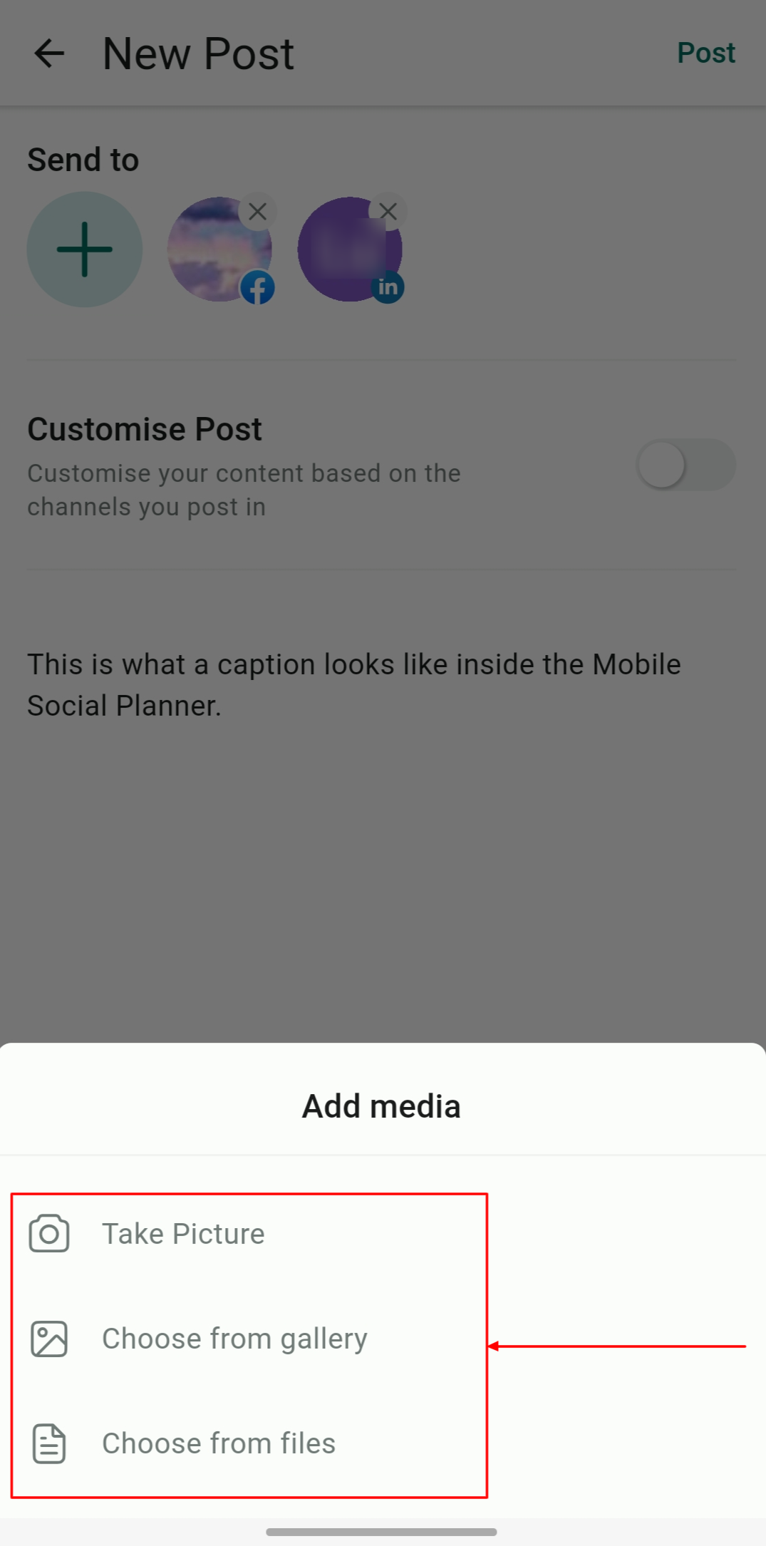 Click on the Media option to add files to your posts directly from your device using the camera, gallery, or files app.