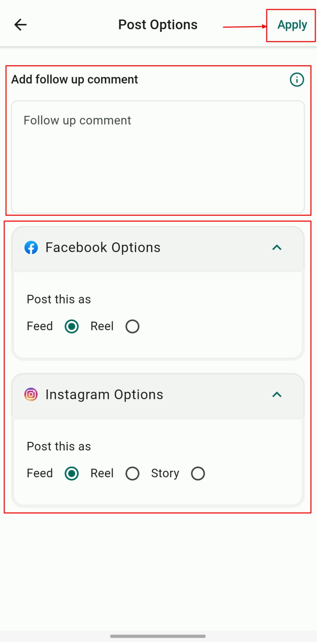 On the "Post Option" page you can add a follow-up comment and choose how you want each post to appear on social media. Click on Apply to continue.