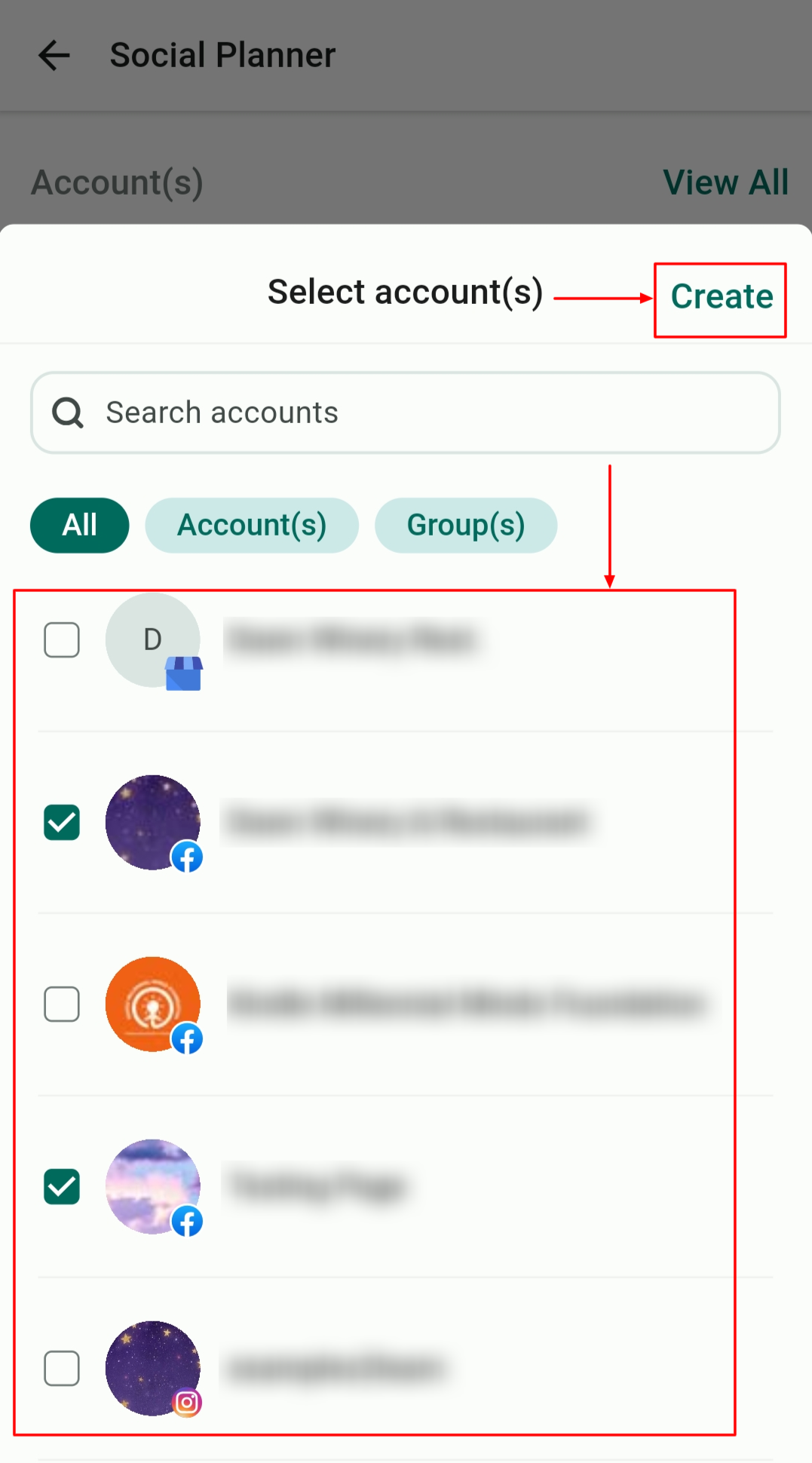 Select the relevant accounts, and click Create to begin customizing your post.