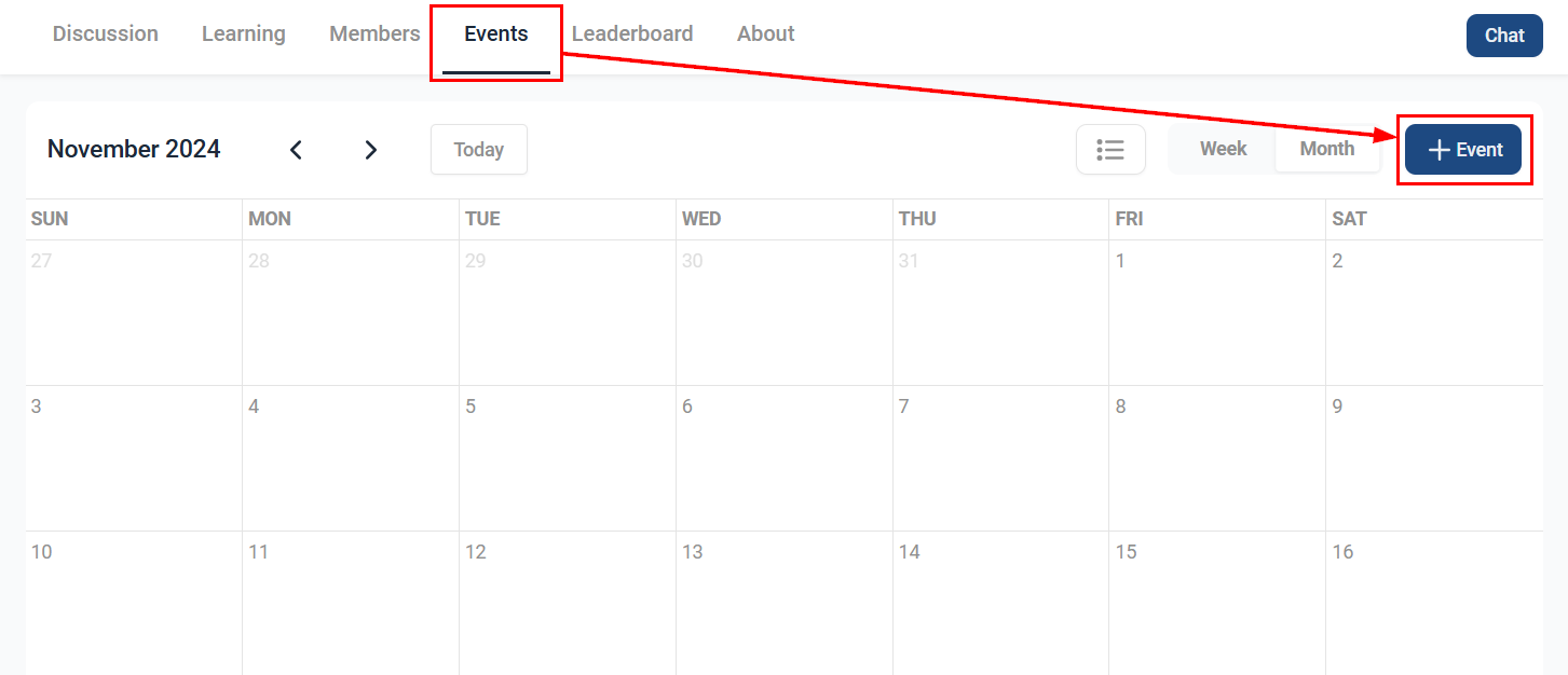 After joining the group, go to the Events tab located in the upper menu. Any past events within the selected timeframe will be displayed in the Calendar view. To schedule a new event, click the +Event button.