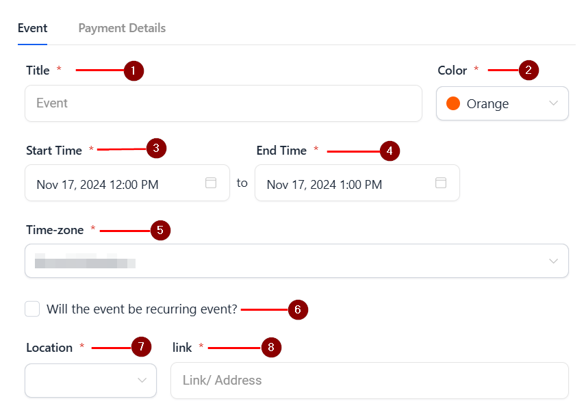 Recurring Event: Indicate if the event repeats (e.g., weekly, monthly). Selecting this box will allow you to set the frequency of the event.