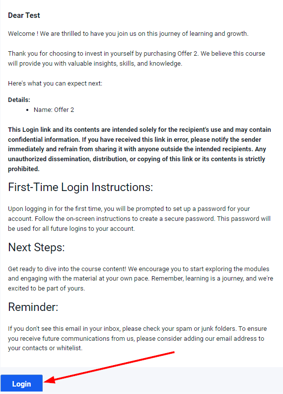 The system will automatically send the initial email when an offer is granted or a purchase is completed, in accordance with your configurations. If the default template has been enabled within the Membership Settings, the email will include a link for login access.