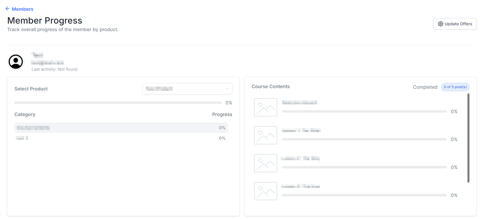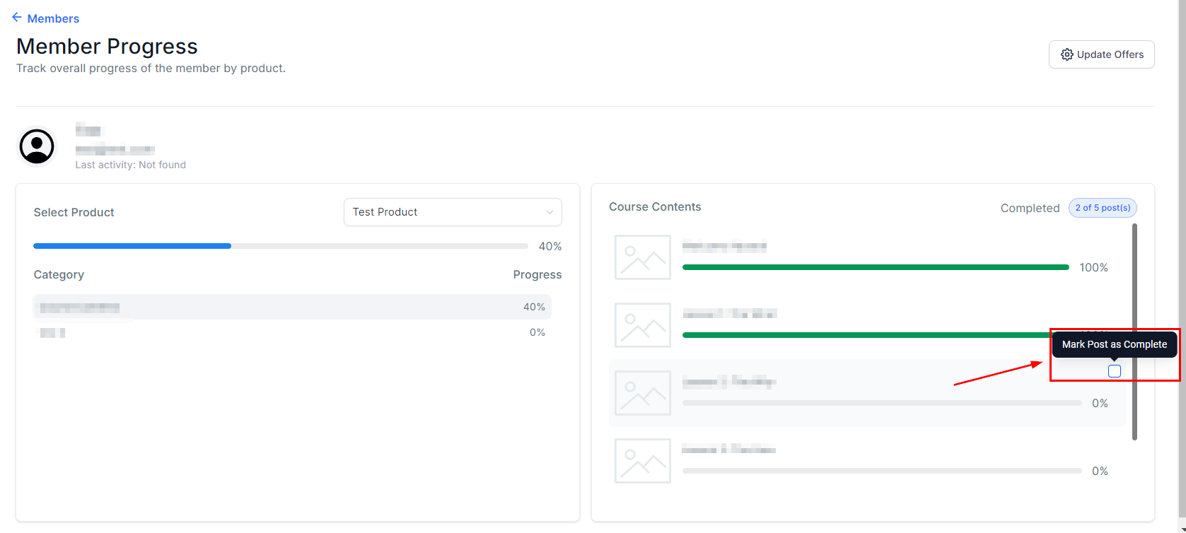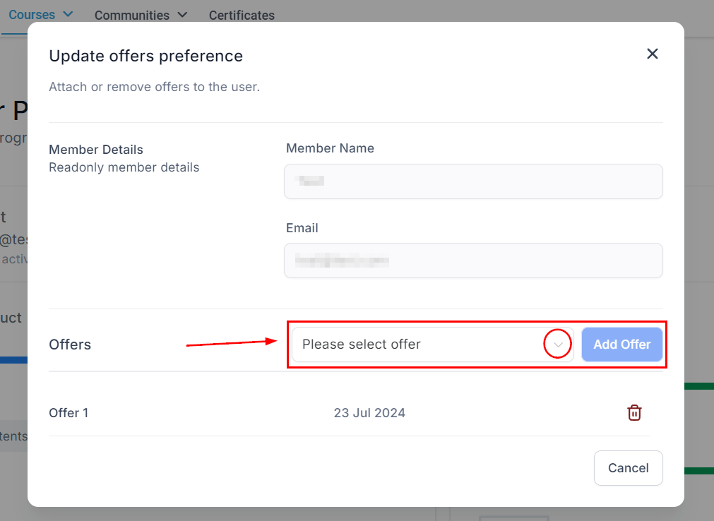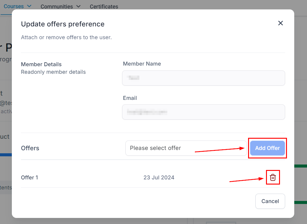 You can add a new offer or delete one of the existing offers for the selected member. This is useful when you have Multiple levels of course bundle to offer.