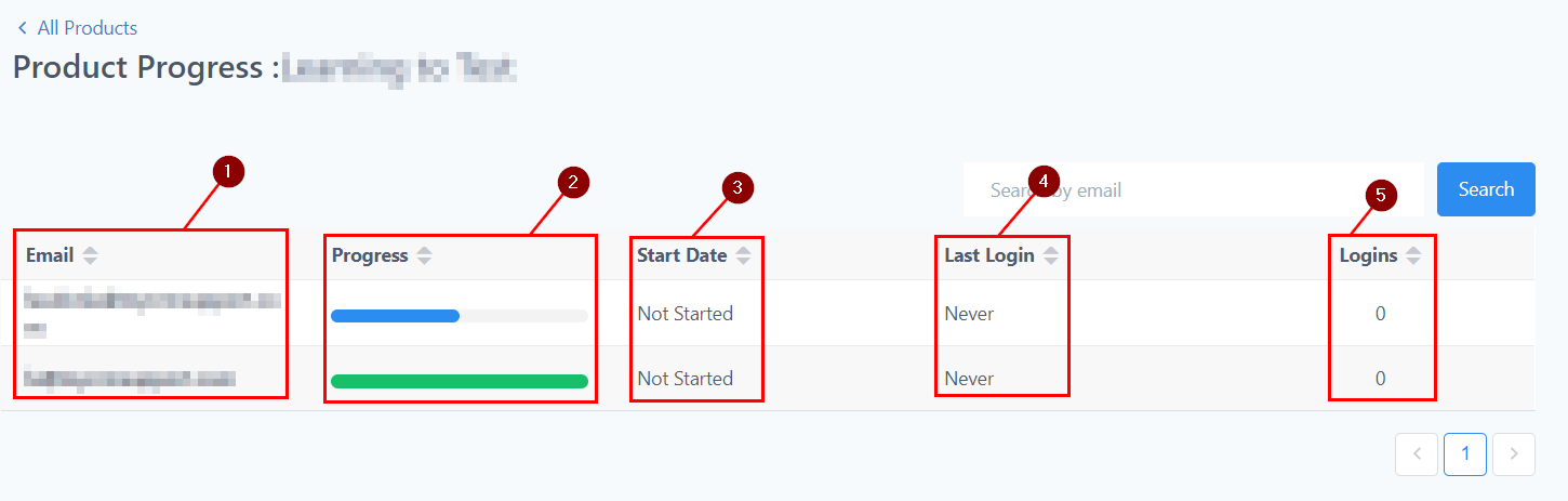 Progress: In this column, you will see the progress of the product using a percentage; 100% means the visitor viewed the whole module of the product, any percentage lesser than 100% means the visitor hasn't completed the module and a visitor without any percent bar means they haven't opened the product at all.
