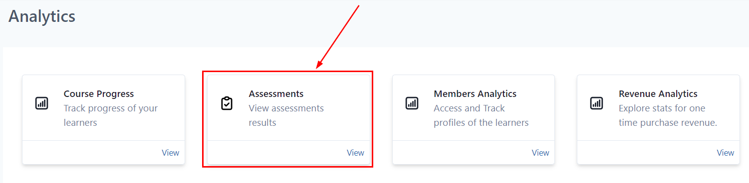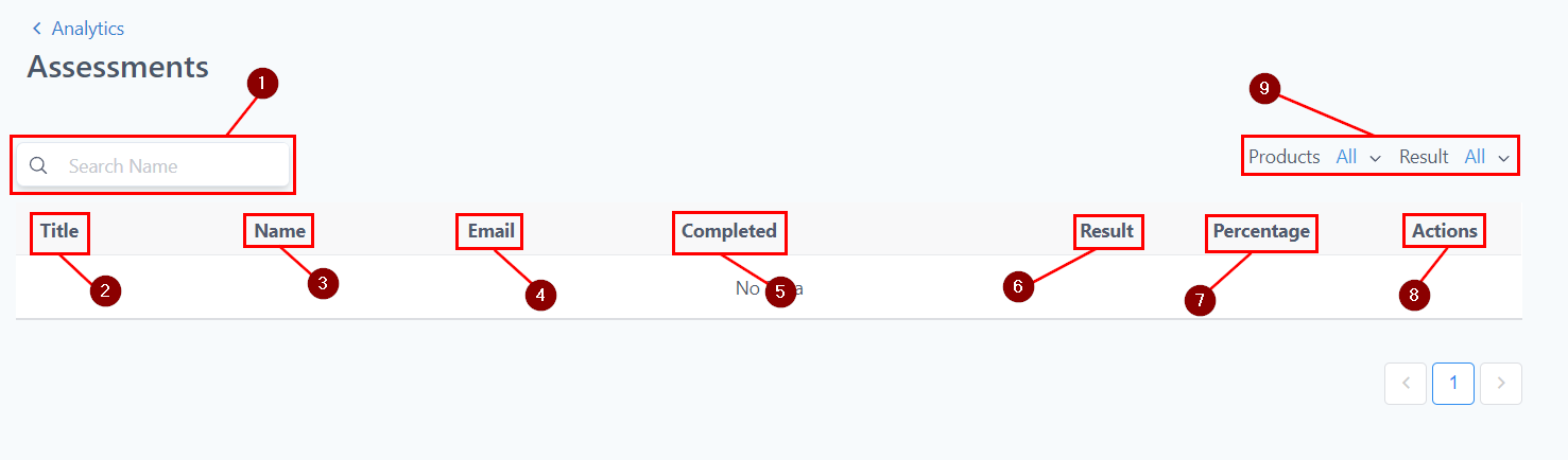Filter: You can filter the Analytics for Assessments from a specific product by choosing the dropdown next to Products on the top right or You can also filter Assessment analytics by Results.