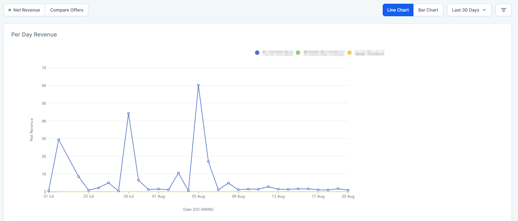 This will deal with data from all offers as a whole, this information is separated into two main graphs. Per Day Revenue which shows your day-to-day total revenue.
