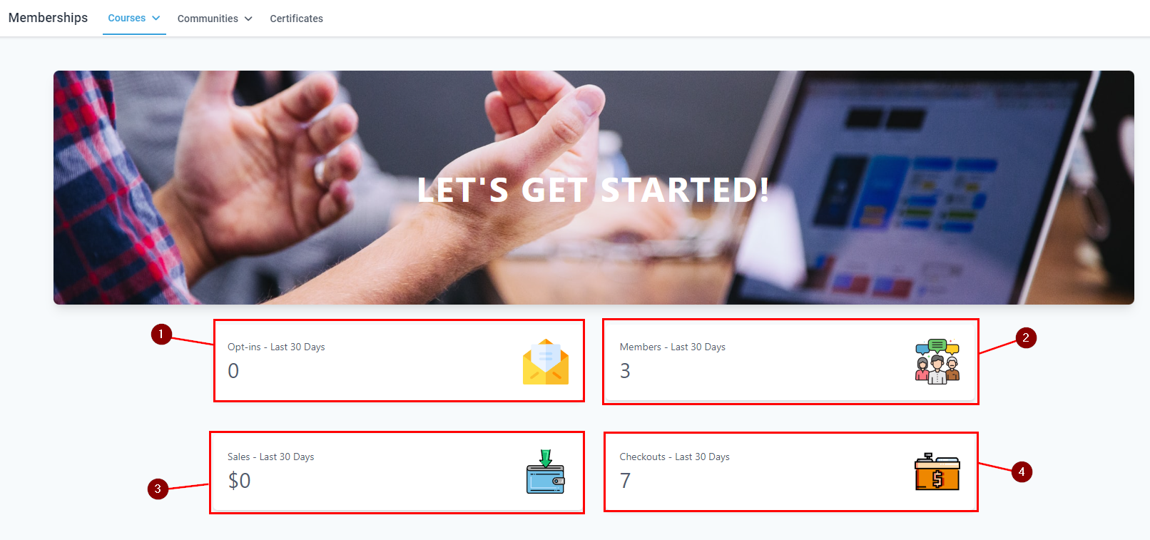 This gives you a quick overview of how many people have opted in for more information (1), how many active members you have (2), how much revenue your courses have generated (3), and how many people added your offers to their checkout (4).