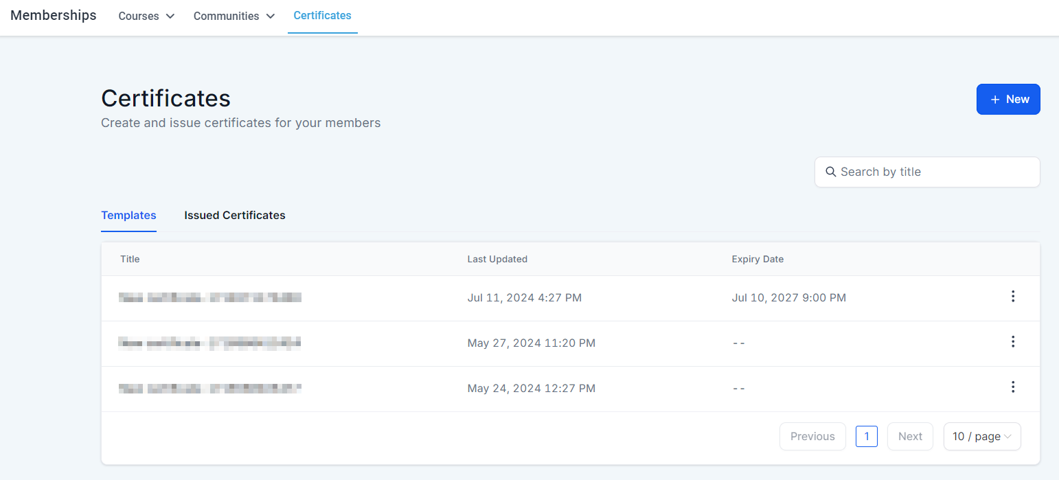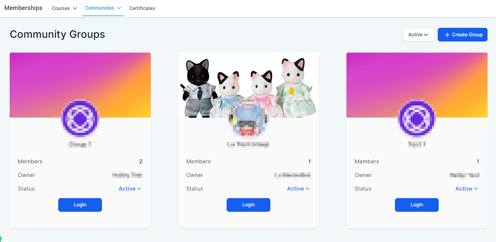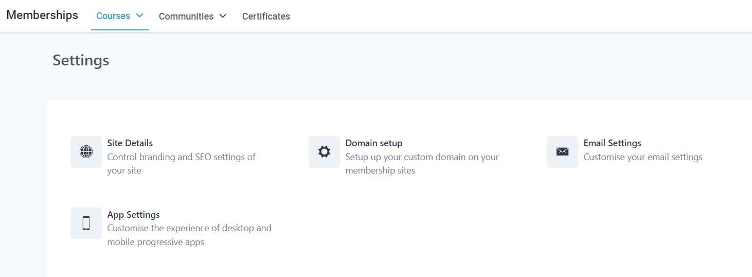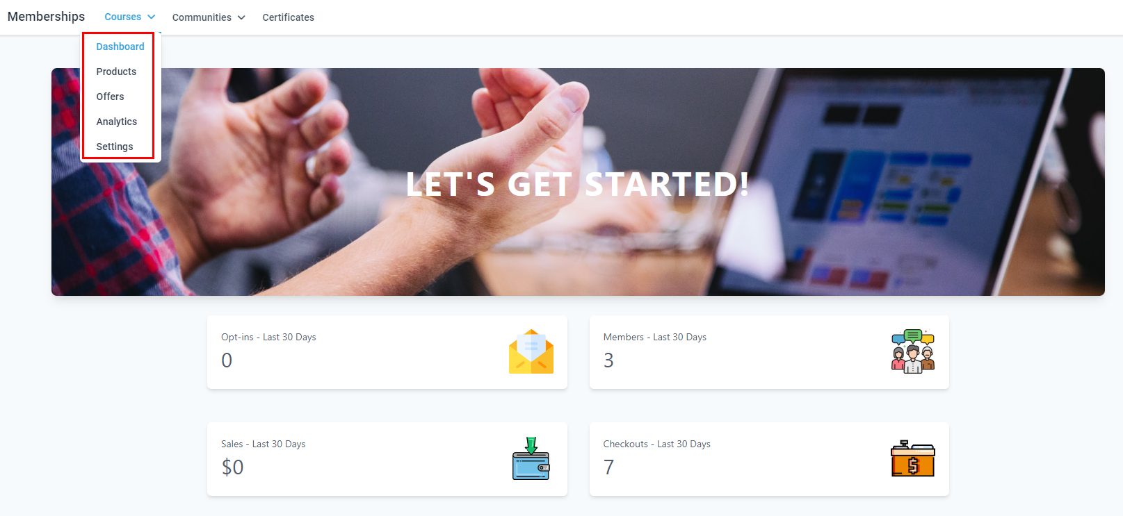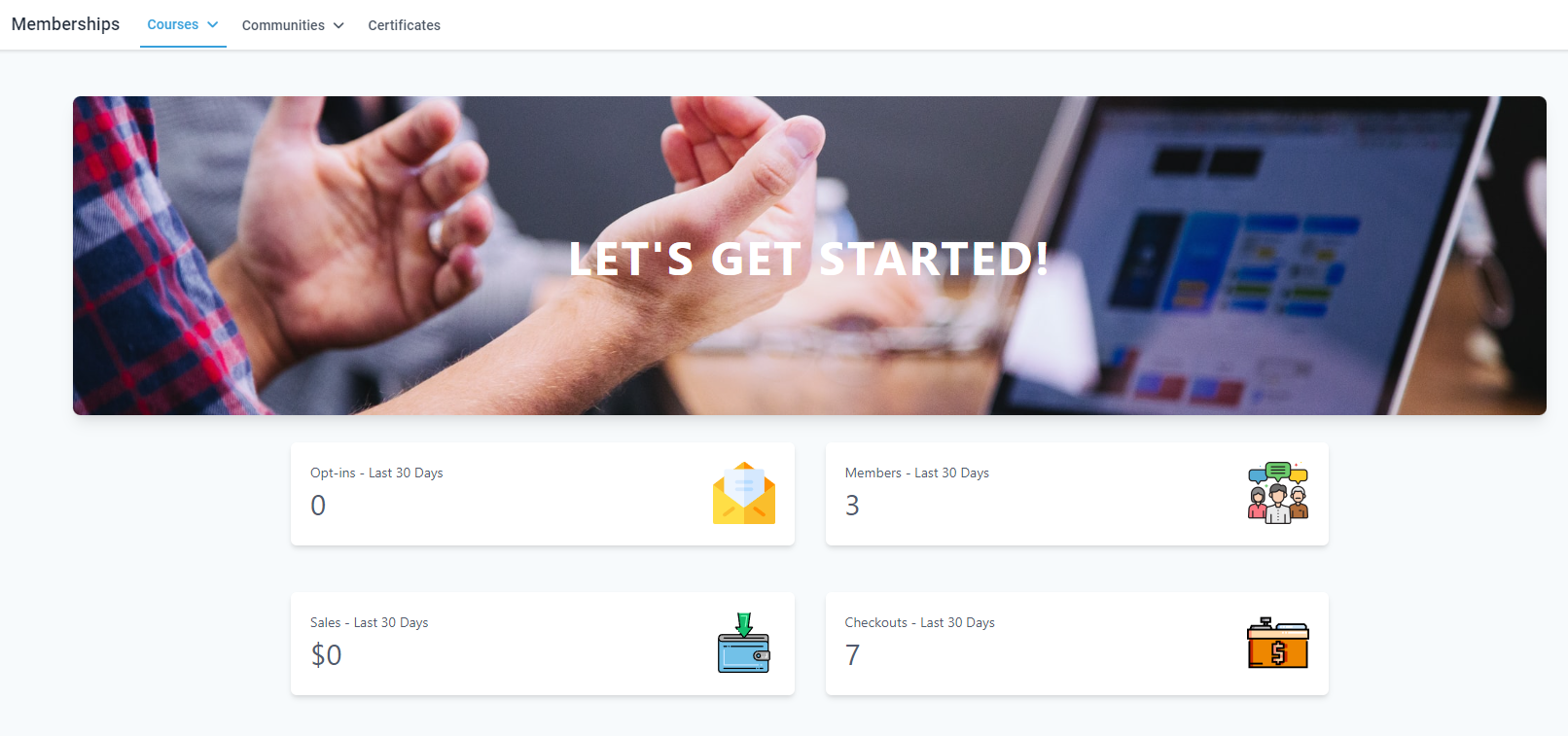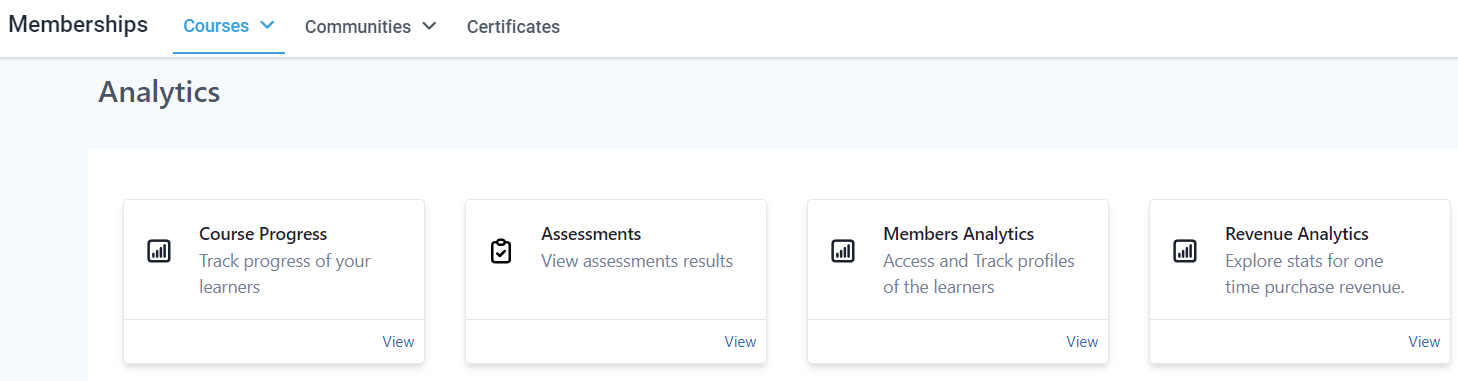 The Memberships section is the place to handle all learning and community-related things. This section houses Courses, Communities, and Certificates, by opening this section you'll be directed to the Dashboard for your Courses.
