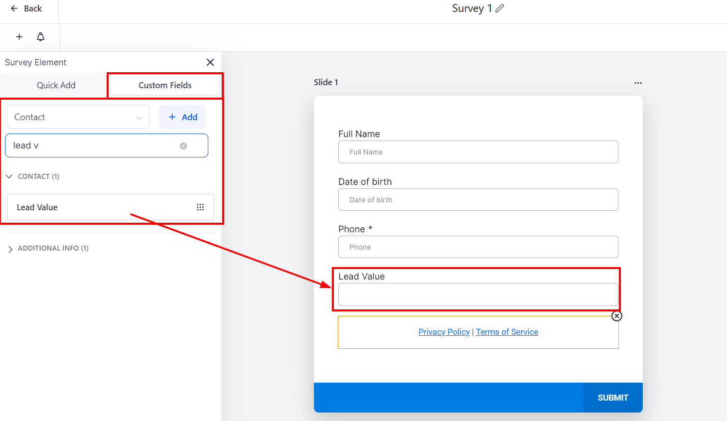 Once your custom field is ready, the next step involves creating a survey that will capture the necessary information to update the lead value.