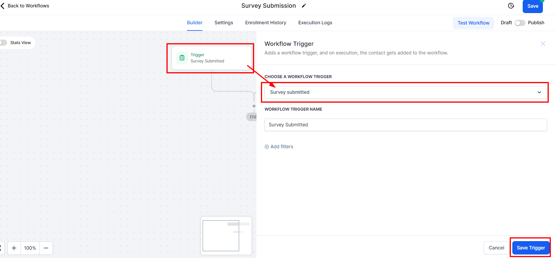 Set the trigger condition to "Survey Submitted" and select the specific survey you've created.