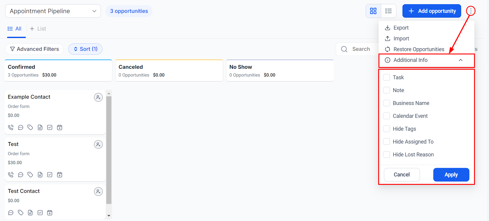 To add more detailed information to your opportunity cards, click on the More Info icon. A dropdown menu will appear allowing you to select the Additional Info option.