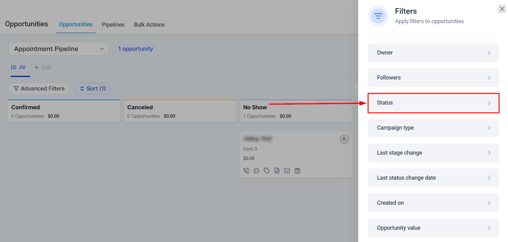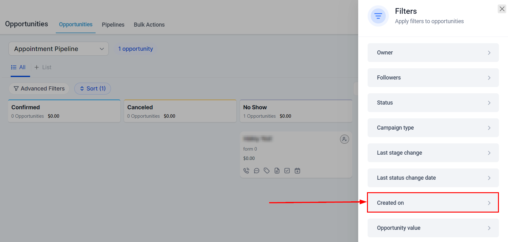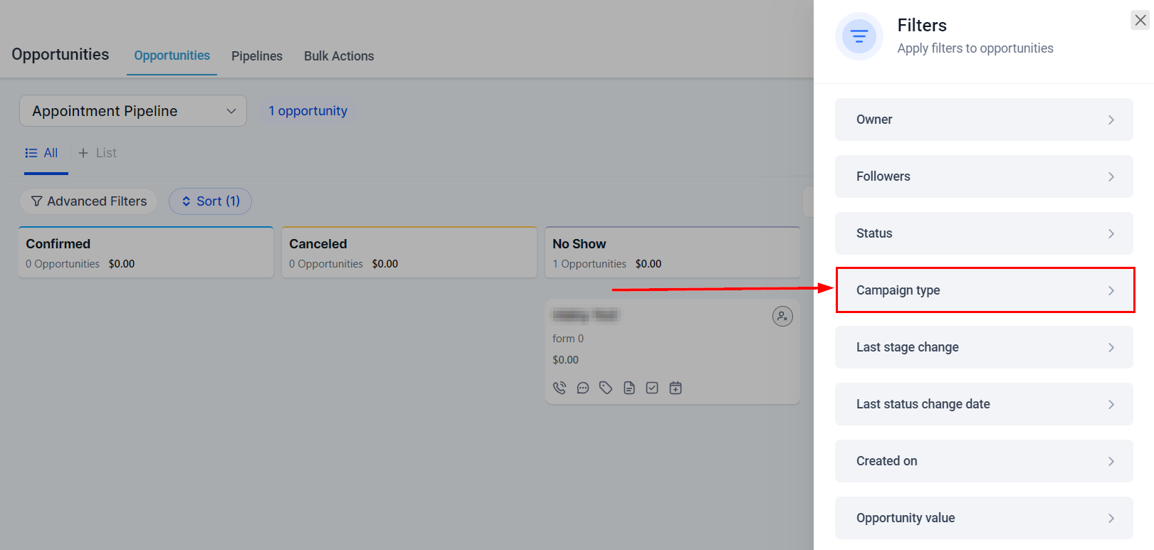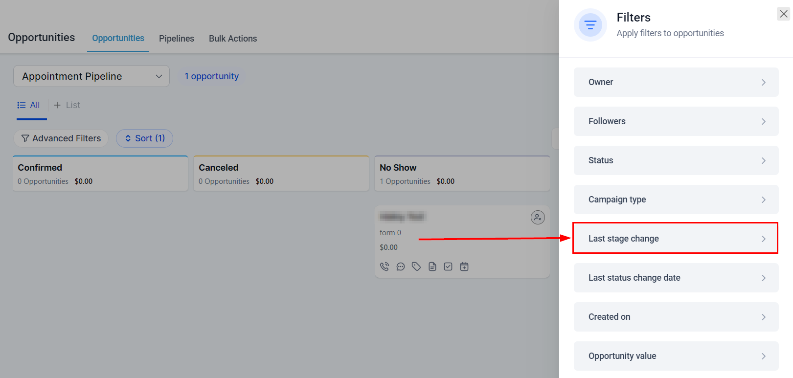 The Opportunities section offers an extensive range of sorting and filtering options designed to provide greater control and deeper insights into your pipeline stage performance. These advanced capabilities empower you to understand and manage your sales process more effectively. You can filter by various criteria, including date, pipeline, user, campaign, and opportunity status, among others. This allows for a more targeted and efficient analysis of your sales pipeline's progress and effectiveness.