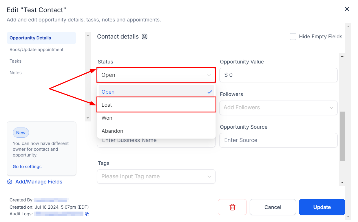 2. Open the opportunity modal and select "Lost" from the status options.