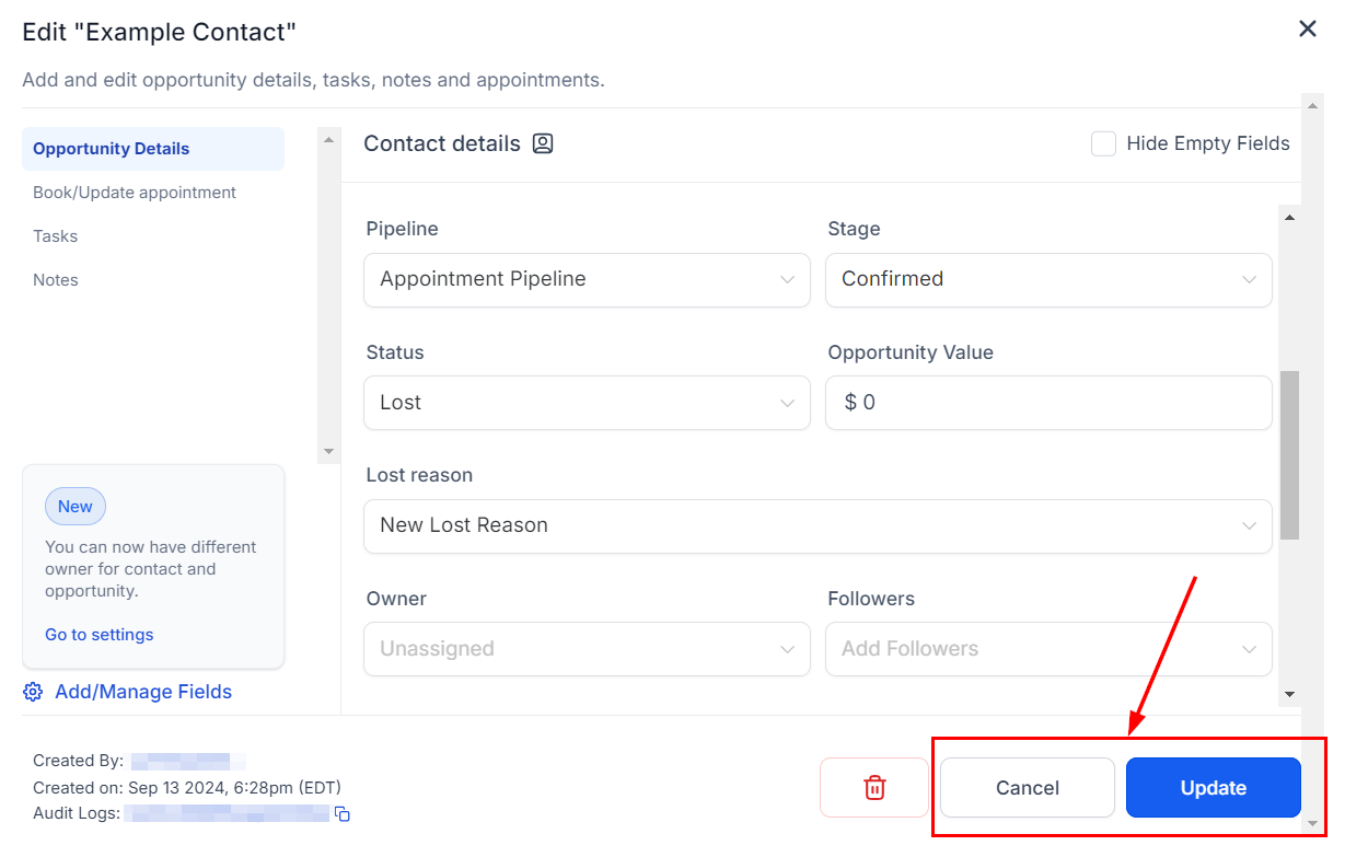 Selecting "Update" or "Confirm" will save the opportunity as lost with the specified reason. Alternatively, if you click "Cancel," your changes will not be saved.