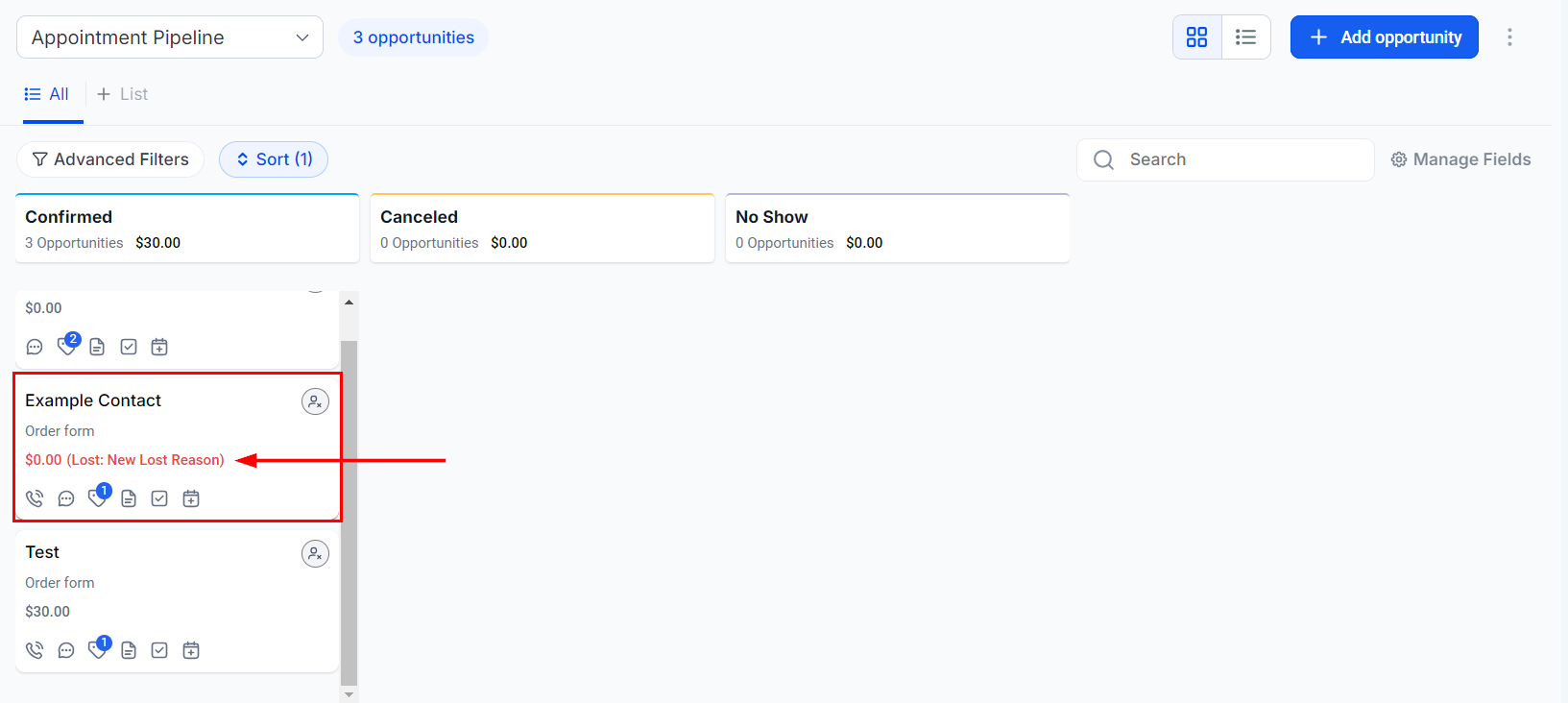 If a lost reason is chosen, it will be displayed directly on the opportunity cards.