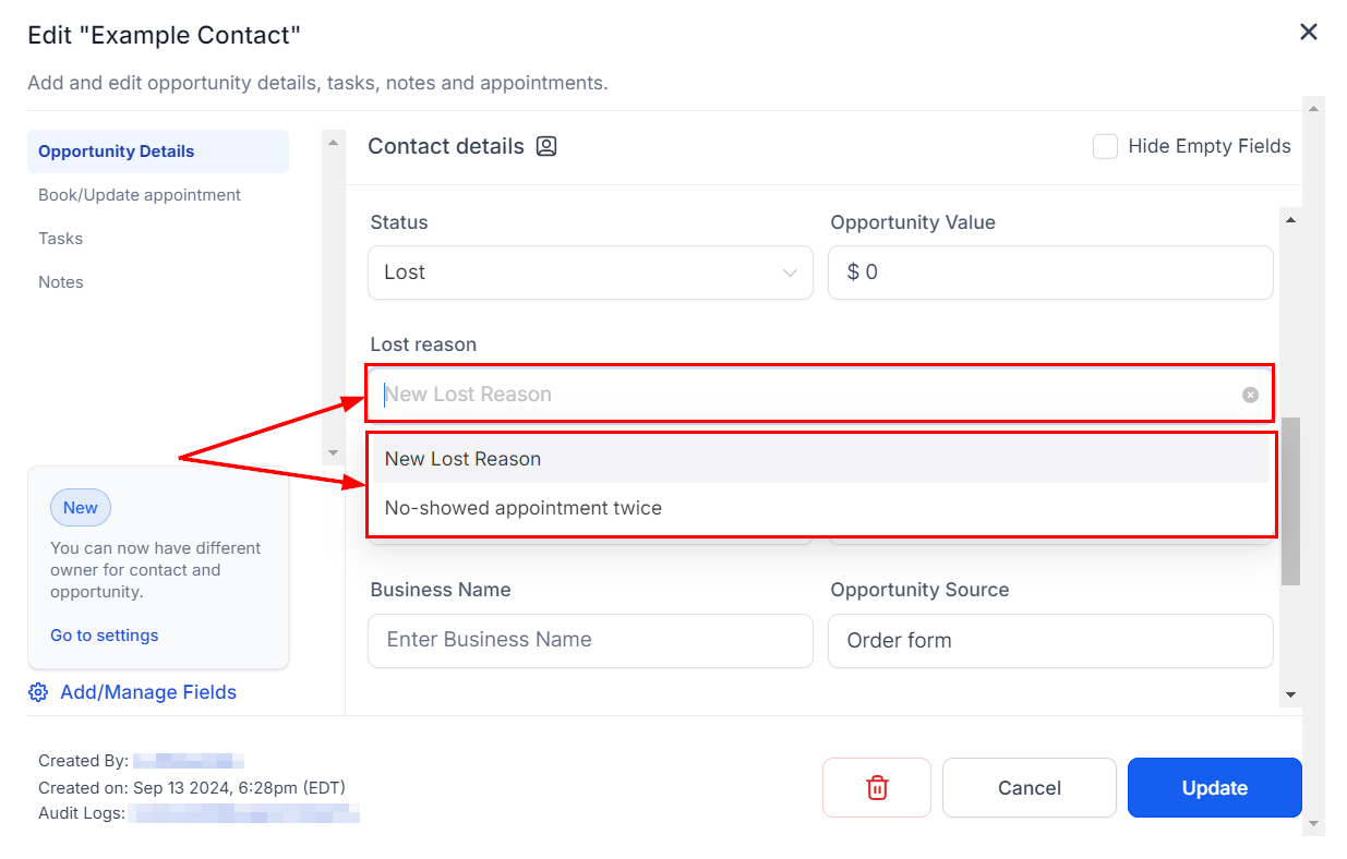 If the available reasons do not accurately reflect your situation, you can easily add a new reason in the Lost Reason field.