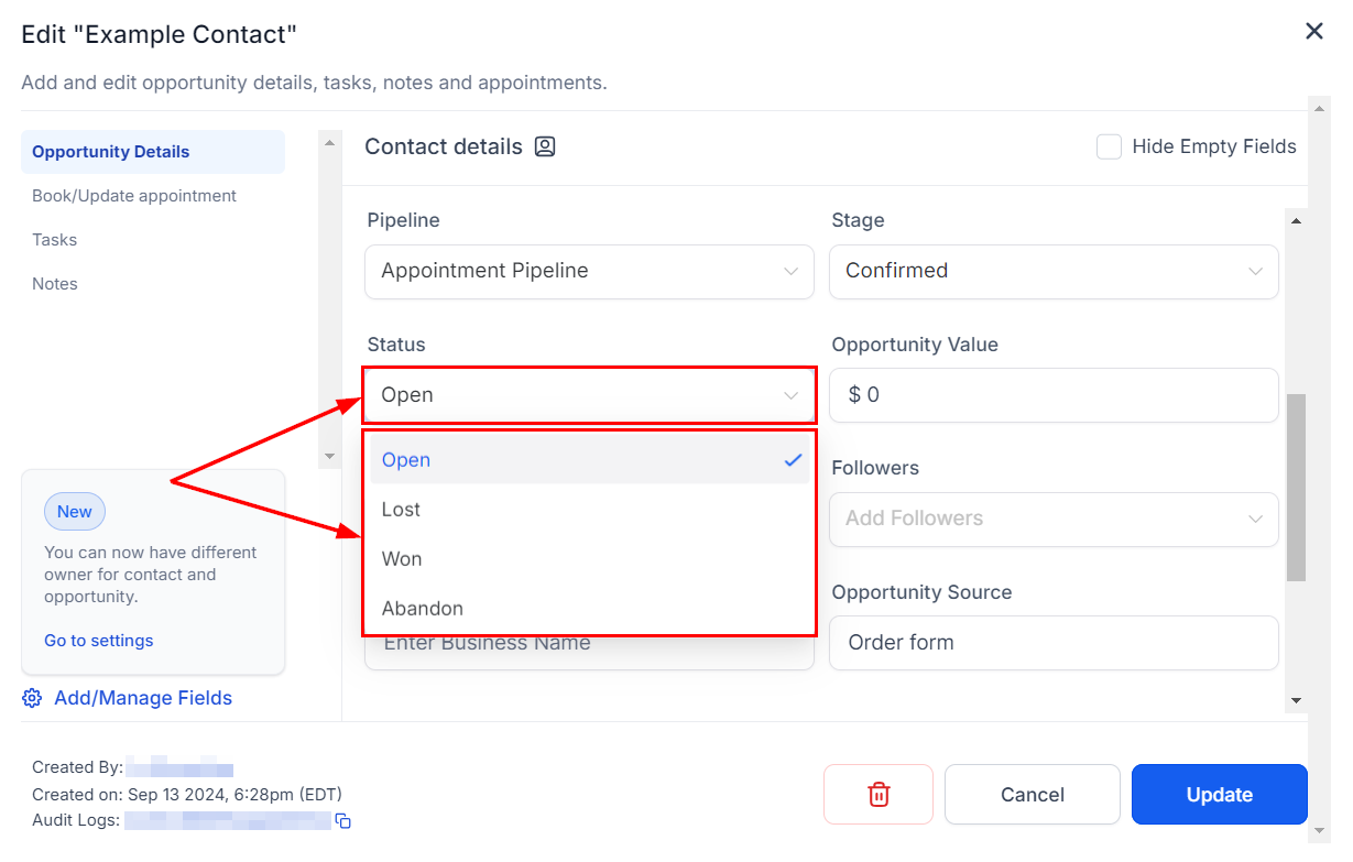 Easily update the status of each lead to reflect their position in the sales cycle, such as open, won, lost, or abandoned.