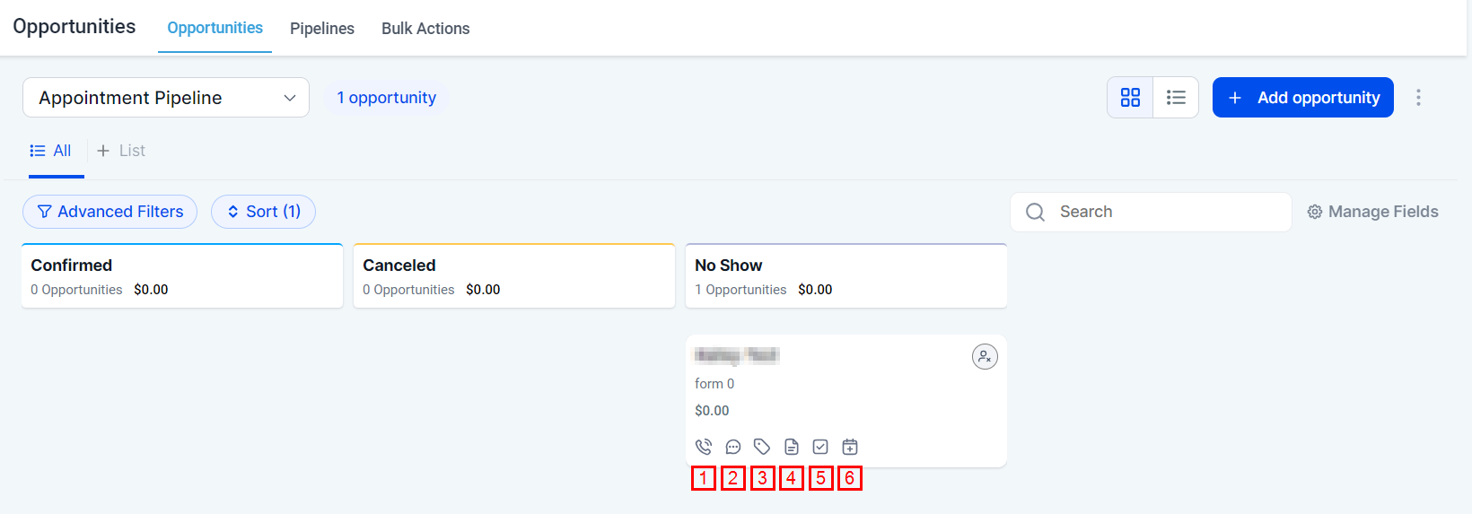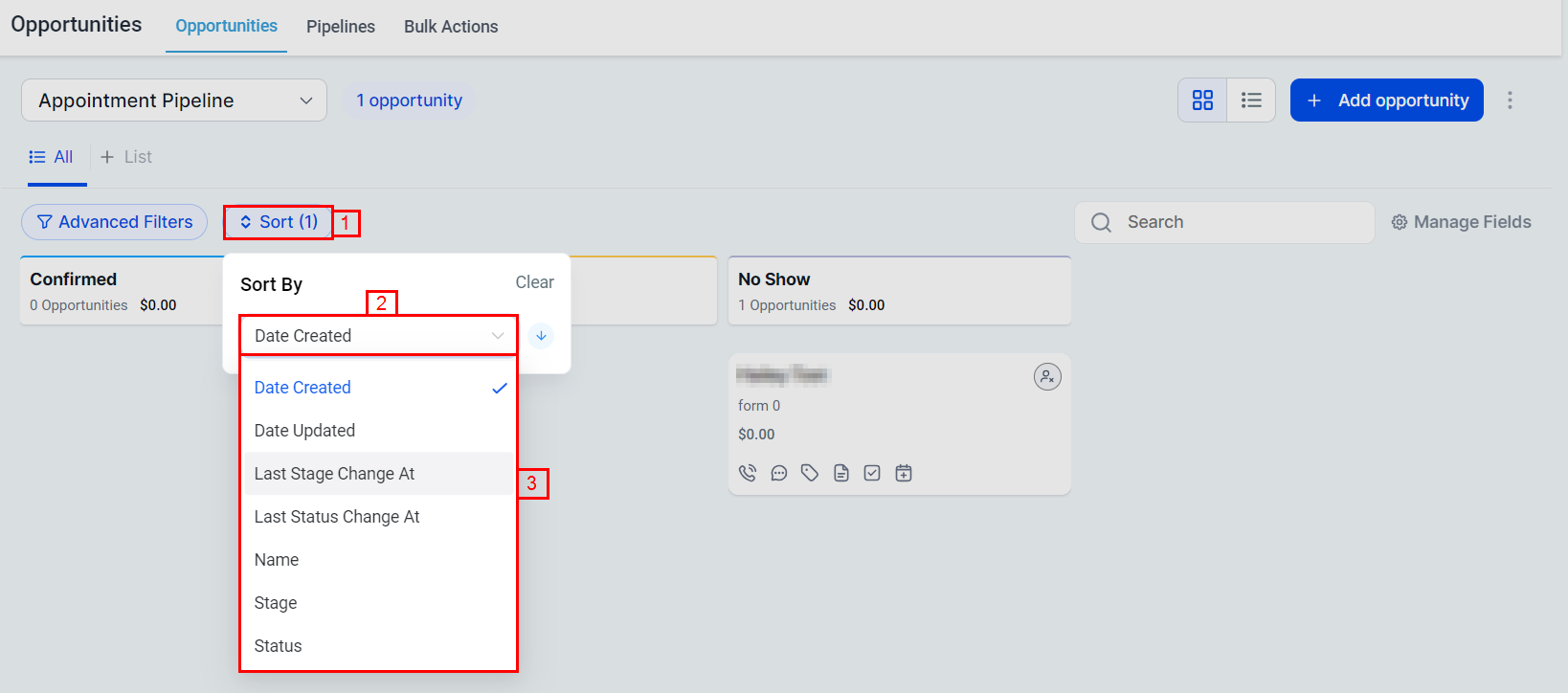 The opportunities section offers a variety of filtering options to provide greater control and insights into your pipeline stage performance. These filtering capabilities enable you to better understand and manage your sales process.