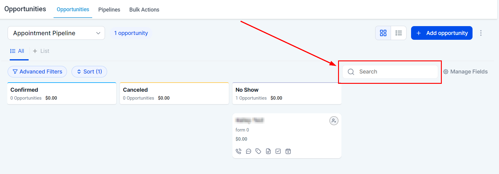 To locate a particular opportunity, utilize the search bar and input any relevant contact details or the unique opportunity name associated with it. This feature allows you to quickly and efficiently find specific opportunities by searching based on identifiable information, streamlining your ability to manage and track their progress in the sales process.