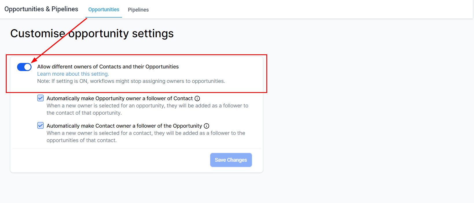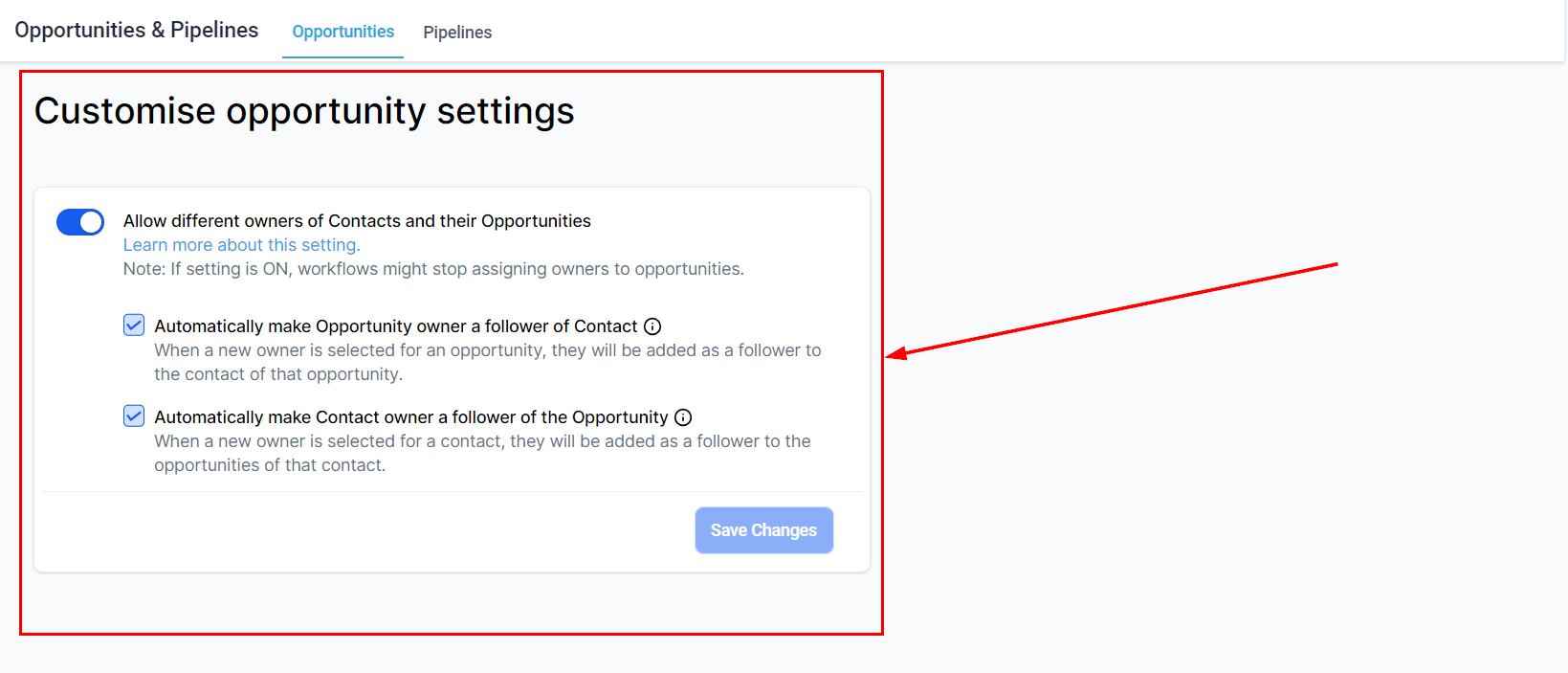 Subsettings: Two additional subsettings are available to enhance functionality:Update Contact Follower Based on Opportunity Owner Change: Enable this setting to automatically update the contact follower when the opportunity owner is changed.Update Opportunity Follower Based on Contact Owner Change: Enable this setting to automatically update the opportunity follower when the contact owner is changed.