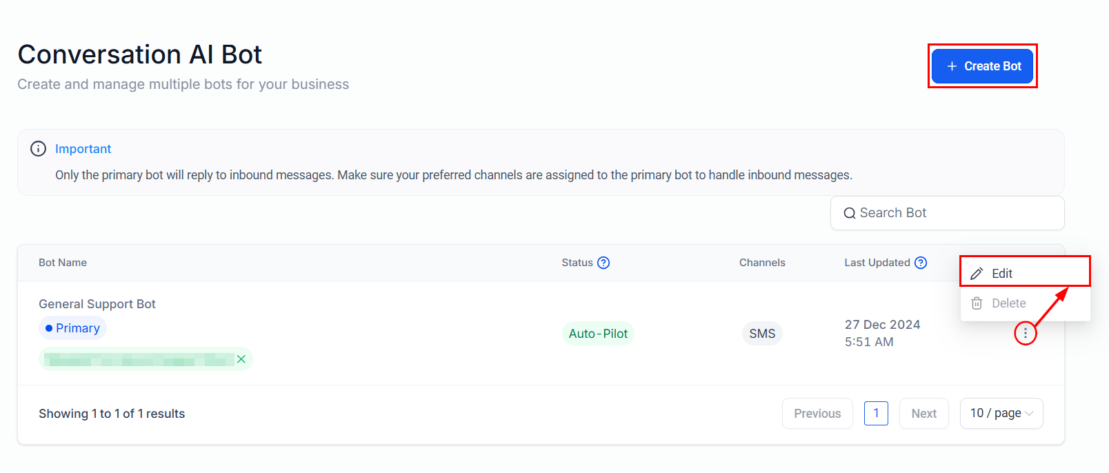 Navigate to the Conversation AI settings in your account, then edit an existing bot, or create a new one.