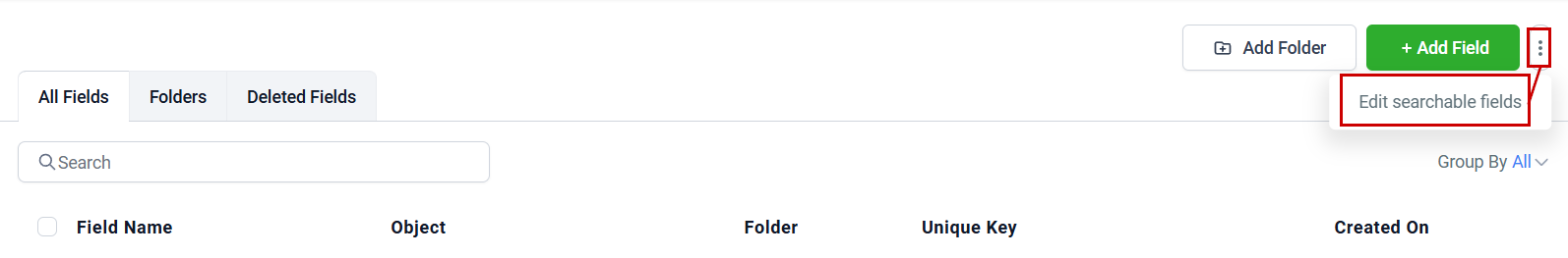 Start by navigating to the Custom Field tab inside your settings and click the three-dot icon to select Edit searchable fields