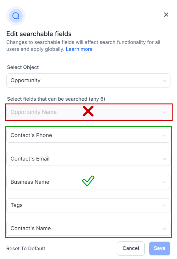 Click Confirm on the next step to change the searchable fields across the CRM.