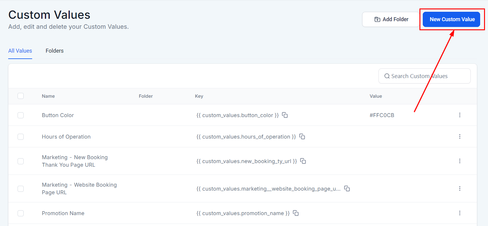 Navigate to Custom Values. This is where you can create custom values for various purposes, such as company details, offers, logos, and more.