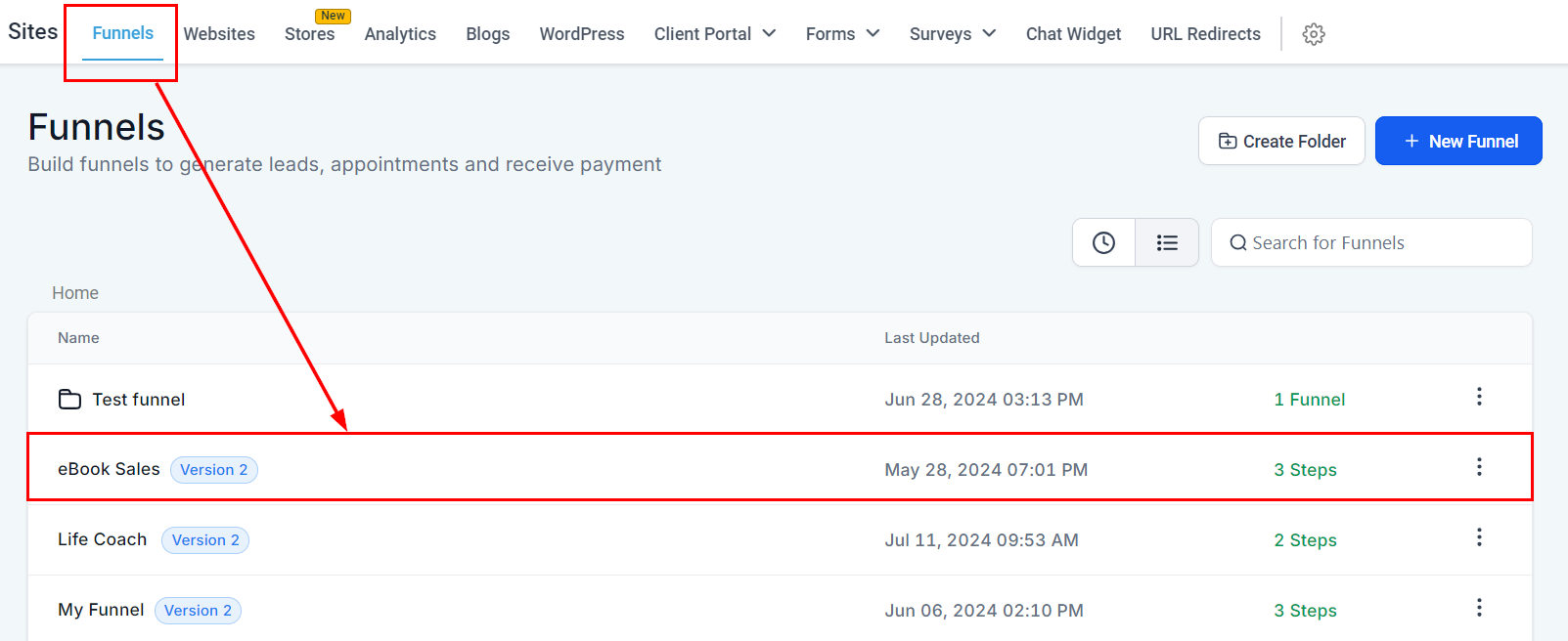 Navigate to the Sites section and select a funnel to open it.