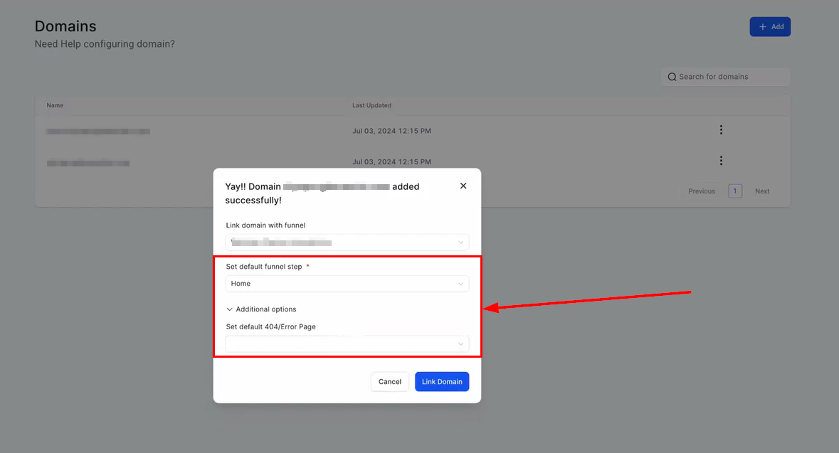5. Set Default Step and Error Page: Select the default step or page for the subdomain, and also choose a Default 404/Error page from the Additional Options.