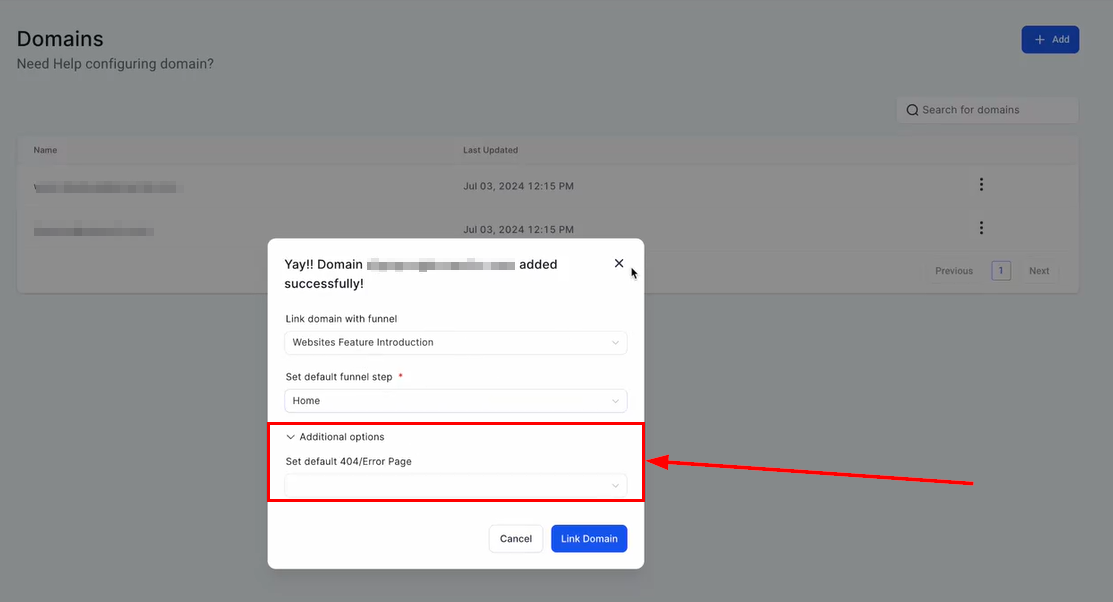 Link Domain: To connect the domain with a funnel or website, select the appropriate option from the dropdown menu and designate the default page for the domain.