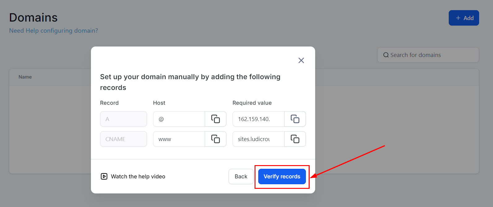 Add Domain: Click on the option to Add a New Domain within the modal.